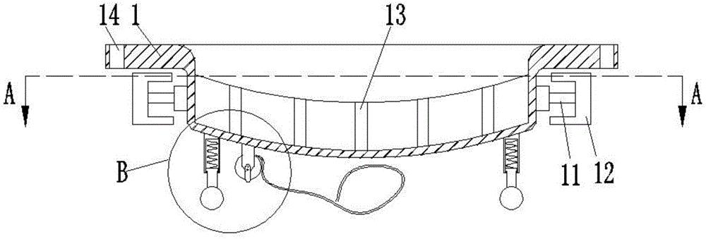 本实用新型公开了一种水下推进器用的下盖,包括壳体,所述壳体的底端固定连接有第一套筒,且第一套筒上滑动连接有球头杆,所述第一套筒的内部安装有第一弹簧,且第一弹簧与球头杆相互抵接,所述第一套筒内侧的壳体外壁上固定连接有安装板,且安装板上通过轴承安装有固定轴,所述固定轴上固定连接有绕线轮,所述壳体的外壁上设置有六组防撞组件。本实用新型能够有效防止水下推进器掉落后损坏下盖,还能防止水下推进器忽然从手中滑落的现象出现,另外能够有效保护水下推进器下盖不受损坏,结构简单,实用性强。
