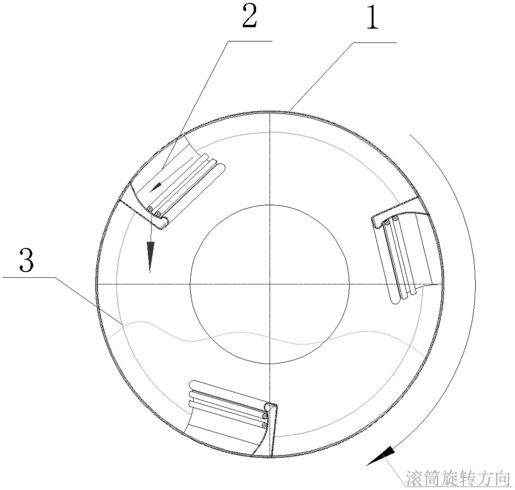 本实用新型提出一种滚揉机桨叶及滚揉机,所述滚揉机桨叶包括桨叶本体,所述桨叶本体整体呈长板状,所述桨叶本体一长侧面与滚揉机滚筒内壁固定连接,所述桨叶本体迎料面横截面为弧形面,所述弧形面沿其长度间隔设置有第一凸起、第二凸起及第三凸起。本实用新型提出的一种滚揉机桨叶及滚揉机,其长板状桨叶弧形表面的第一凸起、第二凸起及第三凸起之间形成导流槽,滚揉机在转动过程中导流槽形成的渠沟能够充分的滚揉物料,且不易堵塞通道。