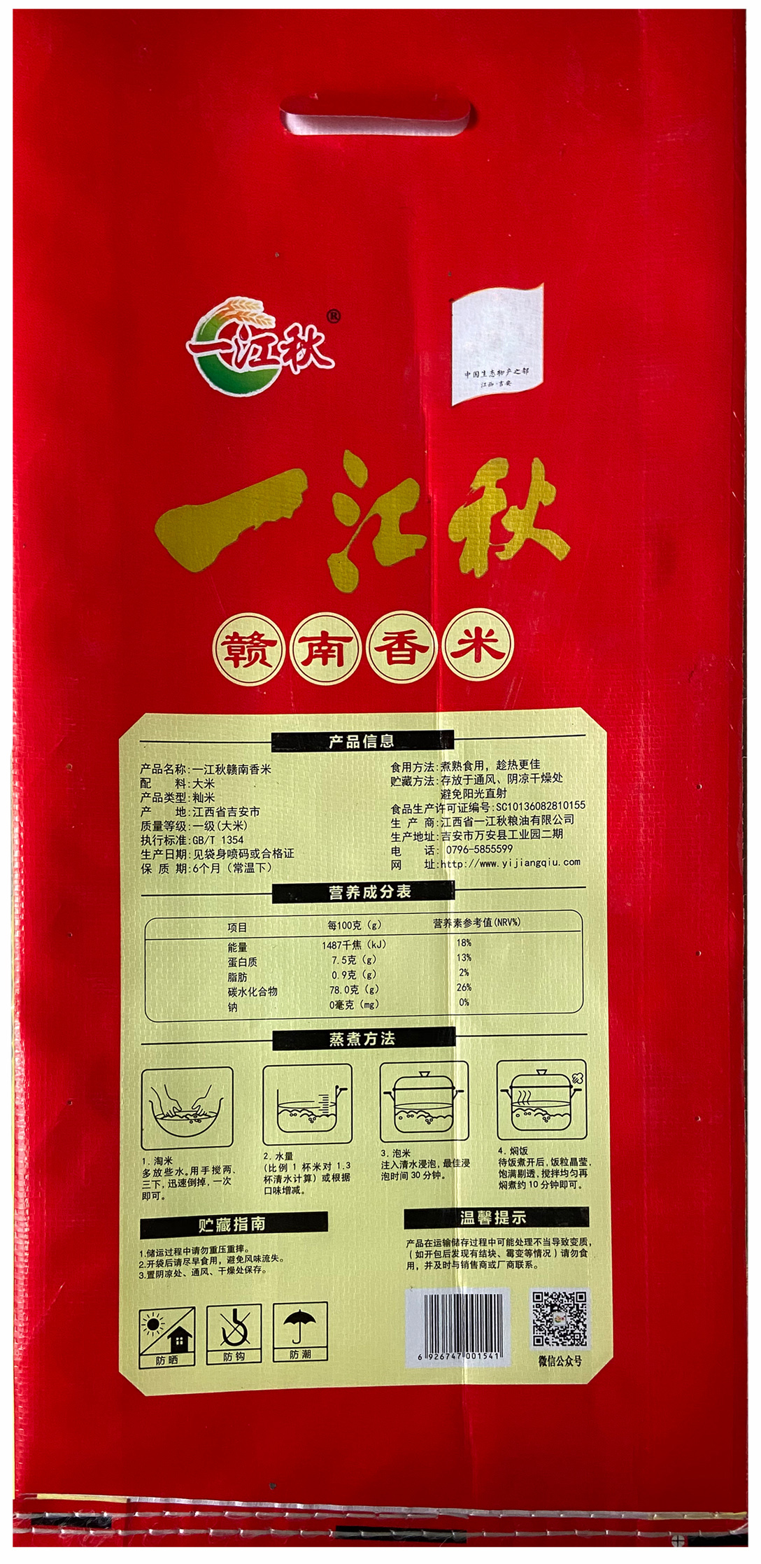1.本外观设计产品的名称:大米包装袋(赣南香米)。2.本外观设计产品的用途:大米包装袋。3.本外观设计产品的设计要点:在于图案与色彩的结合。4.最能表明设计要点的图片或照片:主视图。5.请求保护的外观设计包含色彩。6.本外观设计产品为平面产品,省略俯视图;本外观设计产品为平面产品,省略仰视图;本外观设计产品为平面产品,省略左视图;本外观设计产品为平面产品,省略右视图。