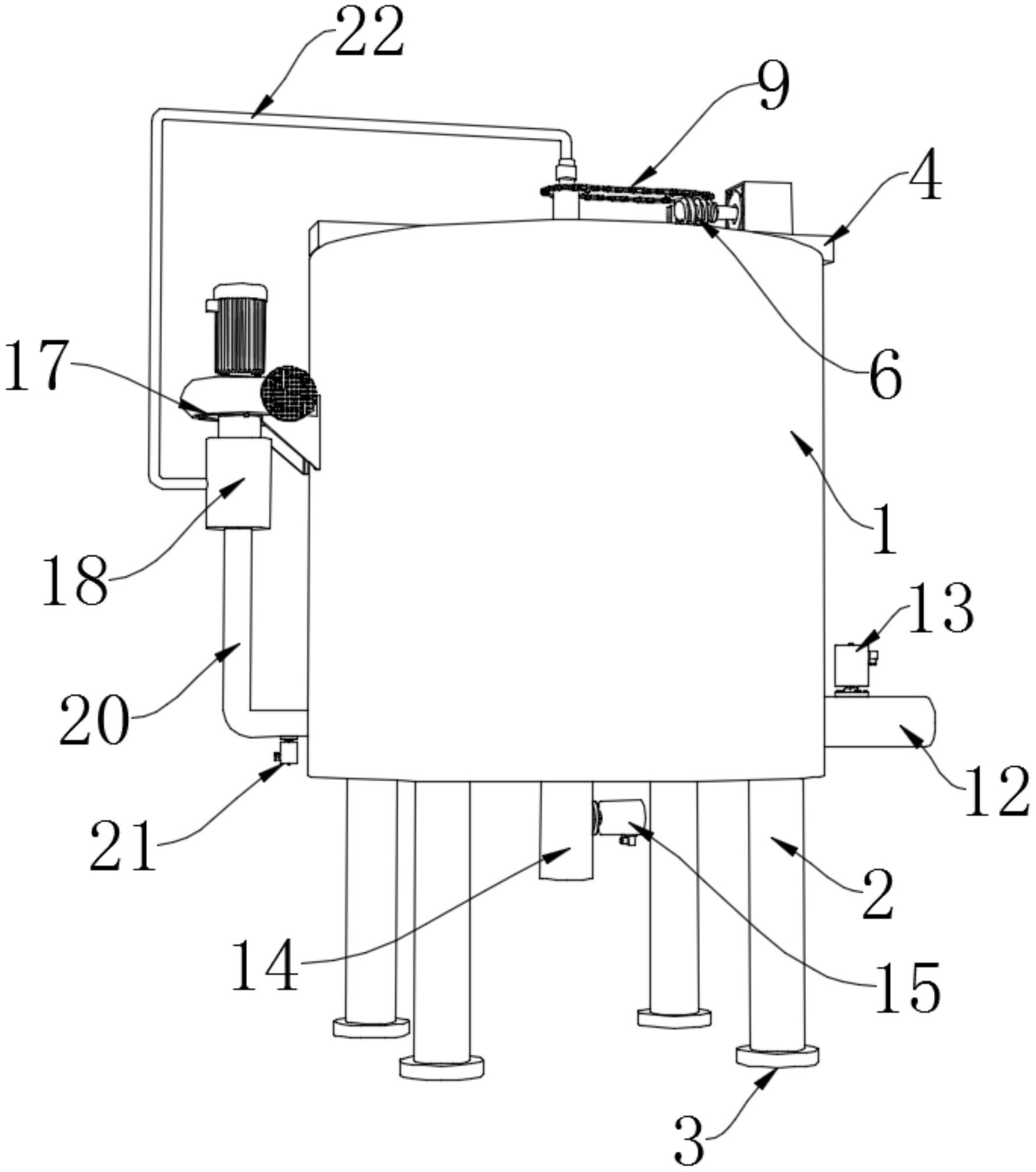 本实用新型公开了一种具有风干功能的大米加工用清洗装置,涉及大米清洗技术领域。本实用新型包括圆形筒,圆形筒的下端固定有多个圆形支柱,圆形筒的下端固定有排污管,排污管靠近圆形筒的位置处固定有第二电磁阀,圆形筒的一侧固定有排料管,排料管靠近圆形筒的位置处固定有第一电磁阀,圆形筒的上端安装有清洗机构。本实用新型通过清洗机构的结构设计,能有效的对大米进行清洗,提升了大米的清洗效率;通过风机、圆形管、电热丝、第一连接管、第三电磁阀、第二连接管和旋转接头的相互配合,能有效的进行风干,保证了大米的质量。