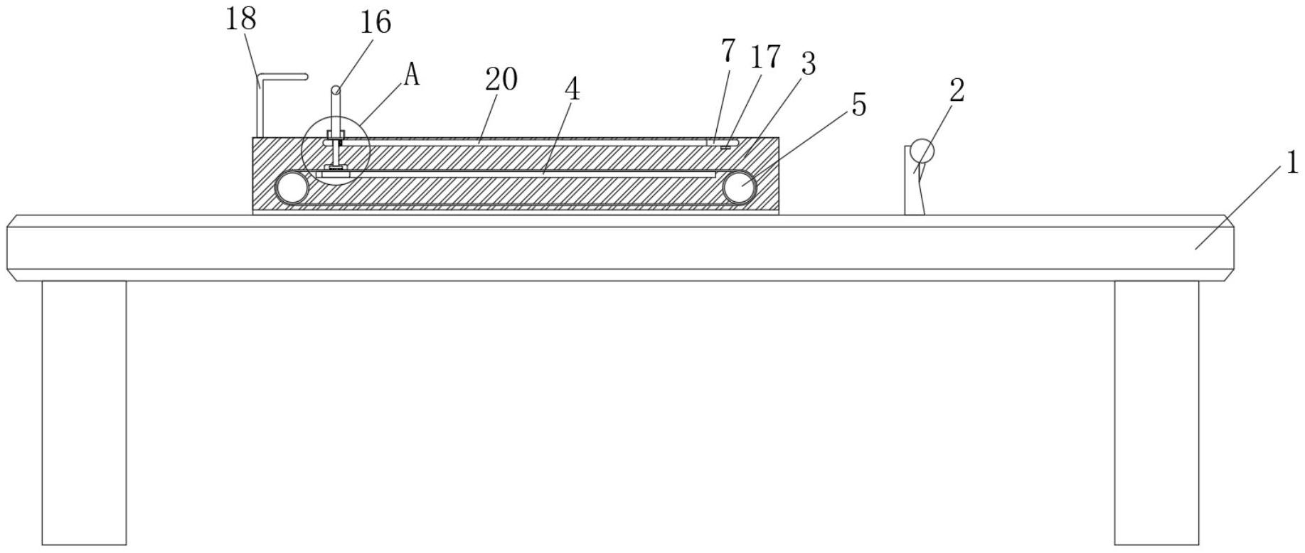 本实用新型涉及假发加工辅助工具技术领域,具体揭示了一种假发剪条机用发带固定结构,包括加工台与用于假发发带裁剪的裁剪组件以及凹形金属框和第一金属板,凹形金属框,所述凹形金属框位于加工台的顶部左侧位置处,所述凹形金属框内壁的正面与背面之间且靠近左右两侧的位置处均转动连接有转杆,通过抓住T型杆向下施压并向右推动,利用橡胶传送带和橡胶垫对裁剪完成后的假发发带起到夹持效果,使得铺设至橡胶传送带顶部且裁剪完成后的假发发带统一向右侧进行滑动,从而实现对批量假发发带同时移动的效果,更有利于工作人员对同批次的假发发带进行裁剪,防止同批次的某根或多根假发发带移动距离不一致的情况出现。