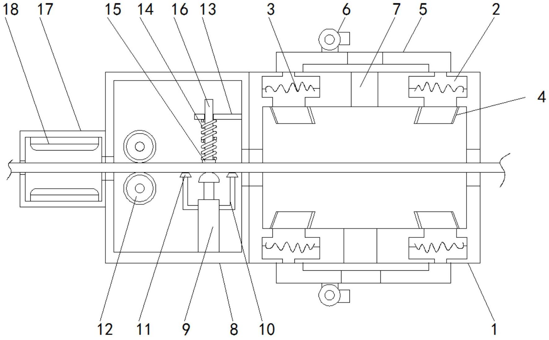 本实用新型涉及印染技术领域,且公开了一种内衣面料印染装置,包括烘干箱,所述烘干箱的内侧开设有四个电热腔。该内衣面料印染装置,通过鼓风机鼓风,风通过分流管进入电热腔的内部,风带走电热丝产生的热量,经过导风管吹向内衣面料本体,再通过出风孔排出,鼓风机位于出风孔的旁边,将排出的热风重新抽回,较大程度保持热风循环,减少热量的溢散,烘干效果好,电动推杆往复运动,可使抖动块和连接杆间断性抖动,再通过除尘辊进行除尘,除尘效果更佳,除尘更彻底,除尘之后面料进入消毒箱内部,经过紫外线消毒灯进行紫外线消毒,可以有效的杀灭病菌,提升面料的卫生程度,该印染装置,烘干除尘效果好,且有效提升内衣面料的卫生程度。