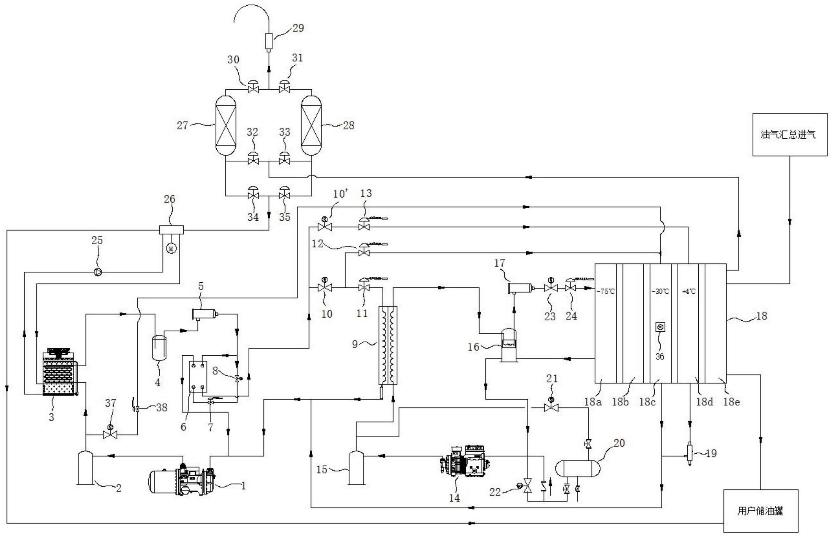 本发明公开了一种基于影像识别除霜技术一体化油气回收装置,包括由油气管道连接的冷凝系统和吸附系统;冷凝系统用于去除油气中的水分,液化并回收油气中含量多沸点高的组分;吸附系统用于回收油气中含量少沸点低的组分;冷凝系统与吸附系统共同连接一冷却设备,该冷却设备用于同时为冷凝系统的一级冷凝和吸附系统的真空泵提供冷却功能。本发明实现单一部件实现多种功能,在机组功能不变的前提下,将原本复杂的油气回收冷凝系统和吸附系统简洁化。利用单一压缩机实现两种蒸发温度,利用蒸发式冷凝器同时解决了冷凝系统的冷却问题和吸附系统的冷却问题,利用影像识别器除霜技术结合电子膨胀阀精准控制冲霜解决了系统长时间低温运行的不连续性问题。