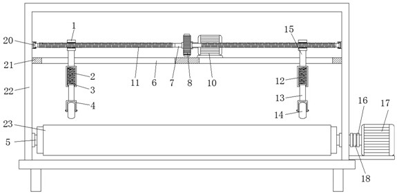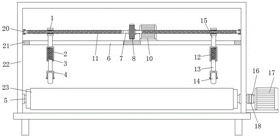 本实用新型涉及玻璃生产技术领域,且公开了一种高效夹层玻璃生产输送系统,包括加工箱体,所述加工箱体内通过第一转轴转动连接有若干转动辊,若干所述第一转轴通过传动装置和驱动电机进行连接,所述加工箱体内壁上连接有若干支撑座,所述支撑座上对称设有条形开口,所述条形开口内均滑动连接有连接杆,所述连接杆顶部连接有螺纹管,所述加工箱体内壁上转动连接有第二转轴,两个所述螺纹管连接在第二转轴的两侧,所述第二转轴外壁上对称设有两个螺纹段,所述螺纹管螺纹连接在螺纹段上;本实用新型设置的滚轮可在玻璃的表面进行滚动,即可满足不同宽度的玻璃的定位,且在复位弹簧的弹力作用下,可满足不同厚度玻璃的定位。