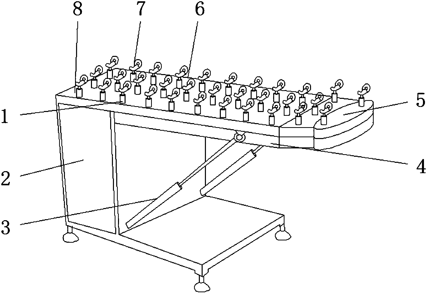 本实用新型公开了一种平板玻璃旋转台,包括转动台和旋转台主体,所述转动台安装在旋转台主体内腔侧端面,所述转动台包括转动盘、第一转动立柱、带动架和第二转动立柱,所述带动架安装在转动台内腔底端,所述带动架上端两侧与第一转动立柱相插接,所述带动架中心位置与第二转动立柱相插接,所述转动盘通过第一转动立柱和第二转动立柱与带动架转动连接,所述带动架内端包括卡接槽、第二电动液压推杆、转动轴、第一转动卡齿、第二转动卡齿和第三转动卡齿,所述第二电动液压推杆安装在带动架内腔中心位置。本实用新型为平板玻璃旋转台,通过第一转动卡齿、第二转动卡齿和第三转动卡齿的设计,实现内端转动。