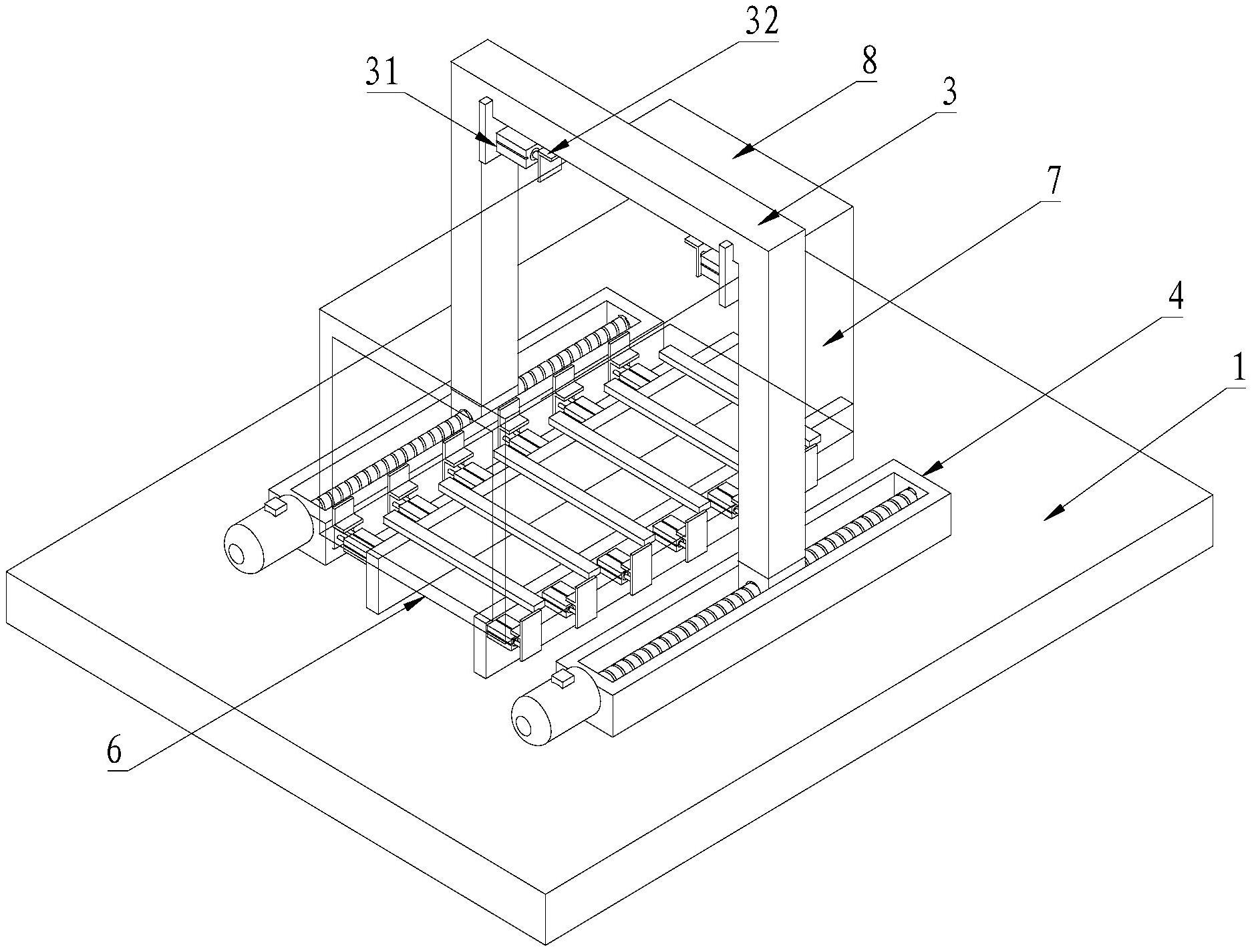 本实用新型涉及玻璃加工技术领域,尤其涉及一种龙门式玻璃合箱机,包括机架以及分别安装在所述机架上的第一合箱机构和第二合箱机构;所述机架包括工作台、横梁和纵梁,所述纵梁水平设置在工作台上,两根所述纵梁相对于工作台的轴线对称设置,两根所述纵梁相互平行,两根以上所述横梁并列架设在两根纵梁之间,所述横梁垂直于纵梁,所述横梁用以支撑玻璃底板;两组所述第一合箱机构分别设置在两根纵梁上,所述第一合箱机构包括第一气缸和第一夹板,所述第一气缸安装在纵梁上,所述第一气缸的气压杆与第一夹板连接,所述第一气缸用以驱动第一夹板在平行于横梁的方向上移动。本实用新型提高了玻璃合箱作业的效率以及合箱后的玻璃产品的一致性。