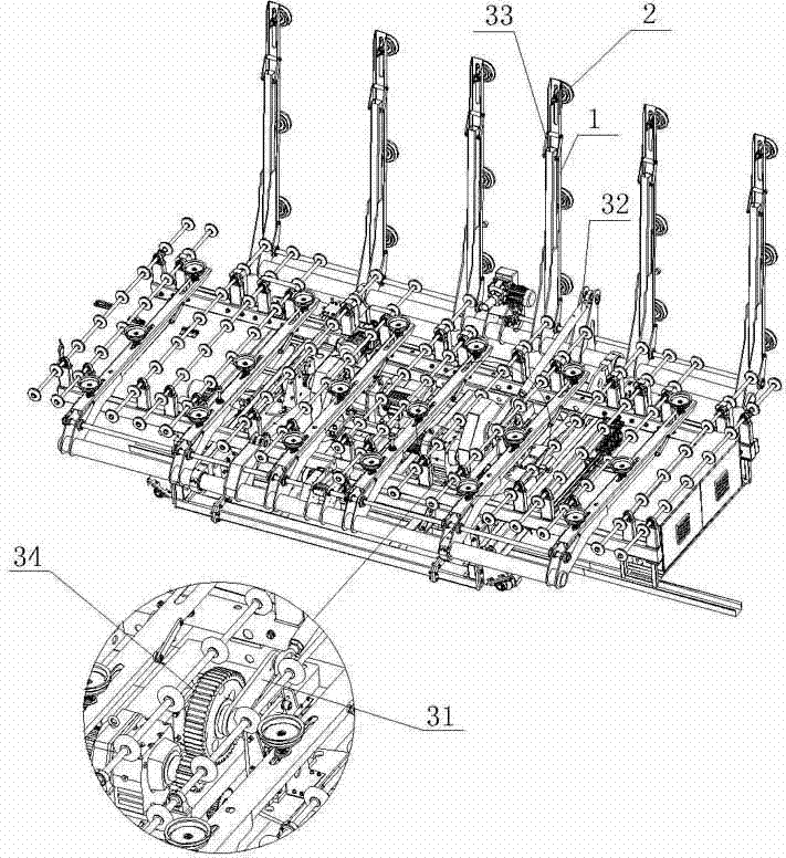 本实用新型涉及一种平板玻璃上片机,包括机架、传动机构、PLC编程及LED触摸屏控制操作台、上片机构、吸盘翻转机构、玻璃提升机构及取片行走机构,吸盘翻转机构包括吸盘架、吸盘以及曲柄摇杆机构,曲柄摇杆机构包括曲柄、连杆及摇杆,曲柄由减速机和一套开式齿轮减速机构驱动,摇杆由翻转臂构成。玻璃提升机构采用往复升降机构及平行四连杆机构。取片行走机构采用齿轮齿条机构,齿轮齿条机构包括齿轮、齿条及导向机构。工位行走机构采用万向联轴器直联减速机驱动,万向联轴器直联减速机包括减速机、滚轮箱及万向联轴器。上片通过机械与PLC集中控制,提高上片效率,全自动完成玻璃装箱,减少人工成本。