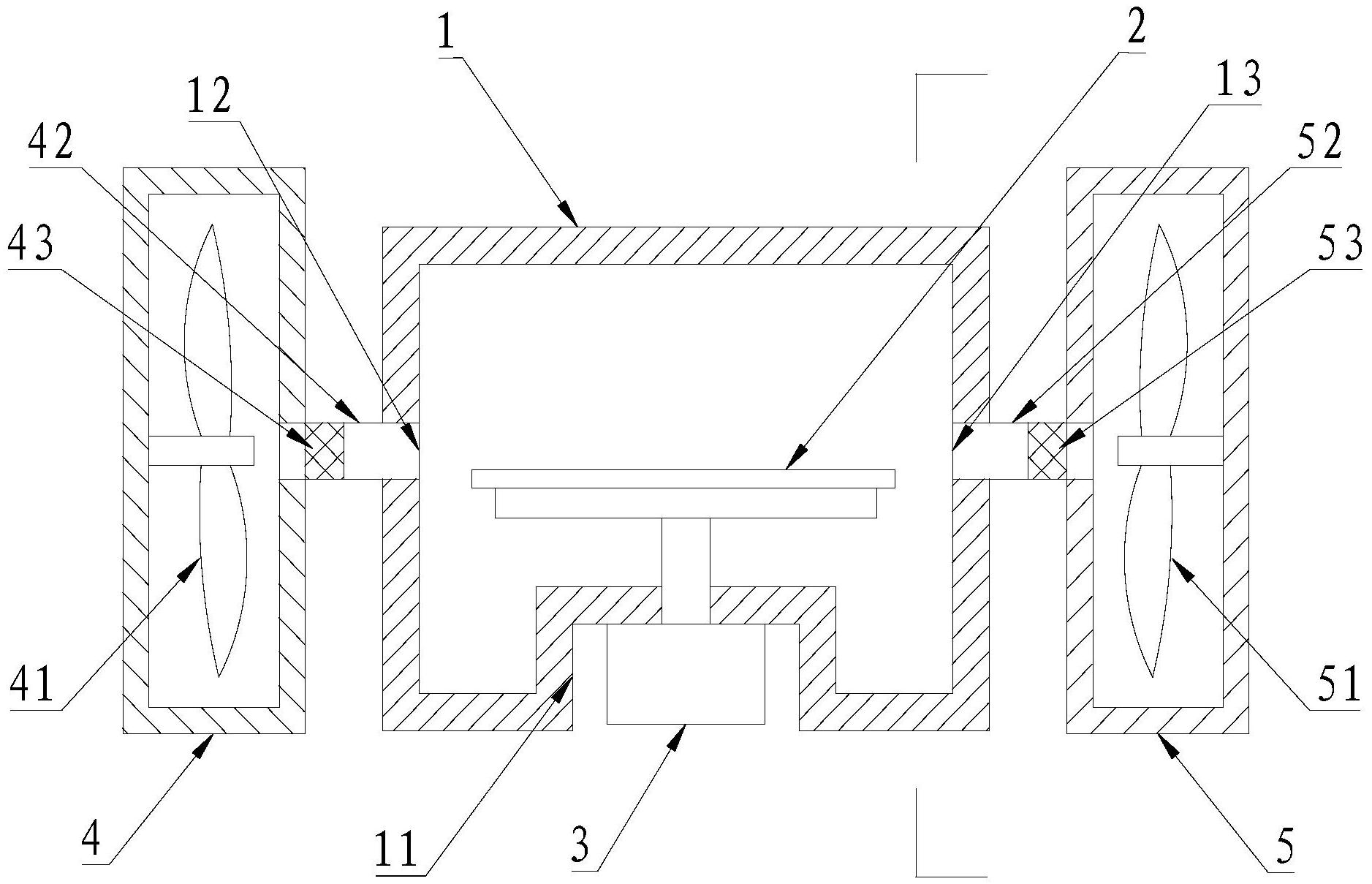 本实用新型涉及玻璃生产加工技术领域,尤其涉及用于平板玻璃干燥的设备,包括干燥箱、旋转托架、驱动电机、进气组件和排气组件;所述干燥箱的内部中空,所述干燥箱的底部设有安装槽,所述安装槽的槽底设有贯通至所述干燥箱的内腔的通孔,所述旋转托架转动安装在所述干燥箱的内腔的底面,所述驱动电机设置在所述安装槽内,所述驱动电机的输出轴穿过所述通孔后与所述旋转托架连接,所述旋转托架上设有用以固定所述平板玻璃的定位块。本实用新型提供的用于平板玻璃干燥的设备相较于传统的烘干设备,可降低烘干过程中有害气体对环境和人体的危害,符合绿色环保的发展理念。