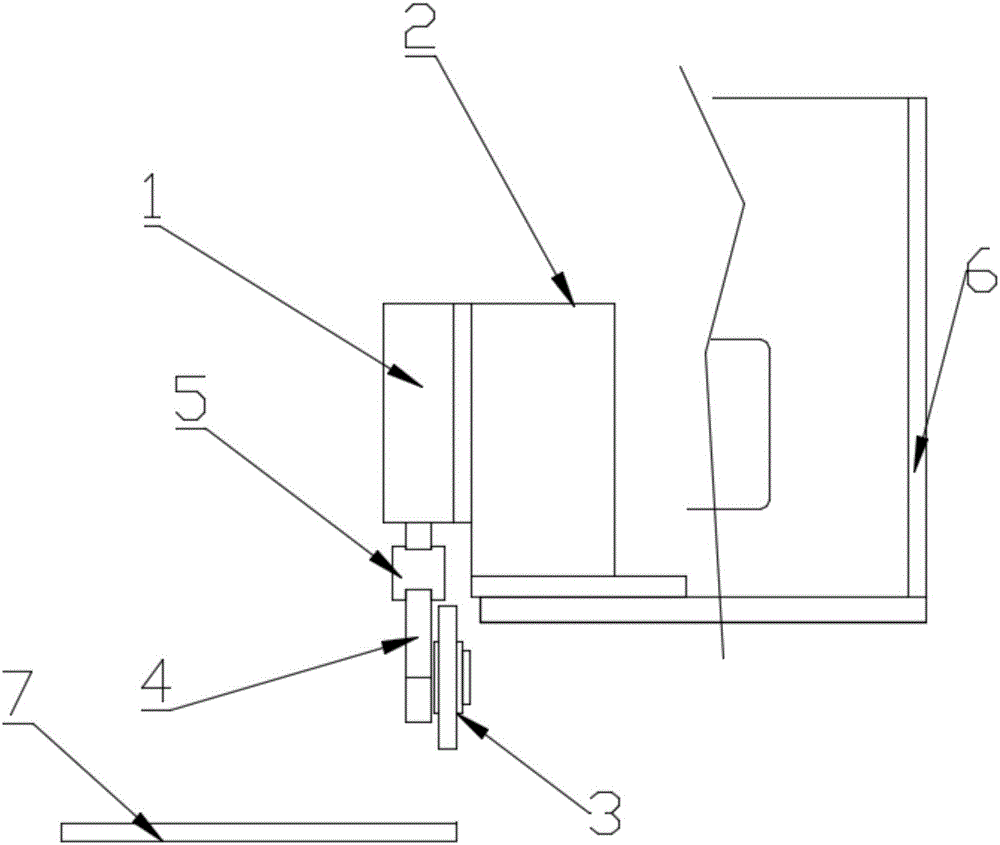 本实用新型公开了一种四边底边磨边机的压紧部件,包括双轴气缸、气缸安装座、压紧轮、压紧轮安装板和气缸顶出杆,所述双轴气缸通过气缸安装座固定安装在升降主安装架上并且双轴气缸和升降主安装架形成一个整体,气缸顶出杆安装在双轴气缸的下端,压紧轮通过压紧轮安装板与气缸顶出杆相连并且压紧轮和气缸顶出杆形成一个整体。该装置结构简单,设计合理,可拆卸性好,便于安装和更换;该装置优化了结构,双轴气缸和升降主安装架形成一个整体,压紧轮和气缸顶出杆形成一个整体,由于双轴气缸推力的特性,使得压紧轮不会碰伤玻璃,提高了玻璃的成品率,提高了玻璃生产厂家的经济效益。