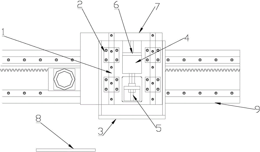 本实用新型公开了一种四边底边磨边机的升降部件,包括导轨、导轨滑块、升降主安装架、气缸和安装座,所述安装座包括气缸前安装座、气缸后安装座和移动主安装座,移动主安装座固定在大梁上端,导轨安装在移动主安装座正面并且导轨与移动主安装座形成一个整体,升降主安装架的背面与导轨滑块相连并且升降主安装架与导轨滑块形成一个整体,导轨滑块与导轨之间采用滑动连接,气缸通过气缸后安装座固定在升降主安装架上,气缸的顶杆通过气缸前安装座安装在移动主安装座上。该装置优化了结构,导轨与移动主安装座形成一个整体,升降主安装架与导轨滑块形成一个整体,使得升降速度变快,从而加快工作效率,提高了玻璃生产厂家的经济效益,使用效果好。