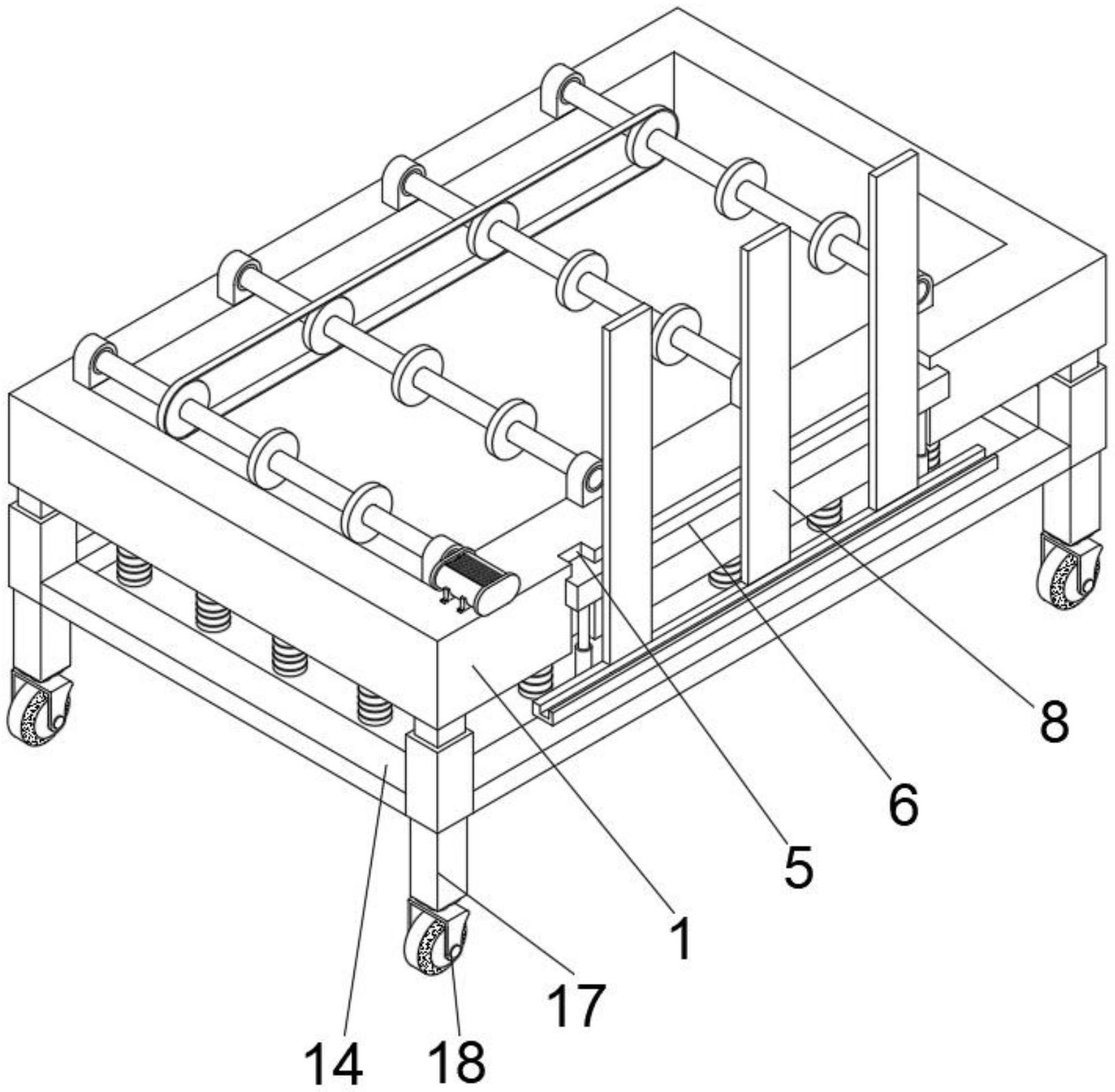 本实用新型涉及玻璃技术领域,公开了玻璃分片机的传送装置,包括传送台,所述传送台的上表面固定连接有固定块,所述固定块的内部固定连接有轴承,所述轴承内壁固定连接有转轴,所述转轴的外表面固定连接有滚动片,所述传送台的一侧开设有活动槽,所述活动槽的内部活动连接有支撑块,所述支撑块的一侧固定连接有铰链。本实用新型具有以下优点和效果:通过设置传送台、固定块、转轴、滚动片、活动槽、支撑块、铰链、支撑板、放置槽和伸缩杆,在通过玻璃分片机的传送装置进行传送玻璃时,将玻璃放置在放置槽的内部,再将玻璃的一侧靠在支撑板上,稳定好玻璃的位置后开启伸缩杆,伸缩杆升高带动支撑块移动位置。