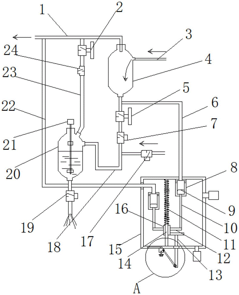 本实用新型公开了一种应用在真空泵上的负压排水器,属于排水器领域,包括上容器、下容器和箱体,下容器位于上容器的下方一侧,箱体位于上容器下方另一侧,上容器的侧壁上与其顶部分别设有第一进气口和第一出气口,上容器的底部连接有第一连接管,第一连接管的另一端与下容器的内部连通,第一连接管上设有第一电磁阀,第一连接管的侧壁上设有水平方向的进气管,进气管位于第一电磁阀的下方位置,进气管上设有第二电磁阀;该装置在负压环境中可自动排水,可自动复位,无需停止负压,且当任意电磁阀发生故障时,可立刻停止自动排水装置转而开启手动排水装置进行过渡,保证自动排水装置发生故障后真空泵可正常使用。