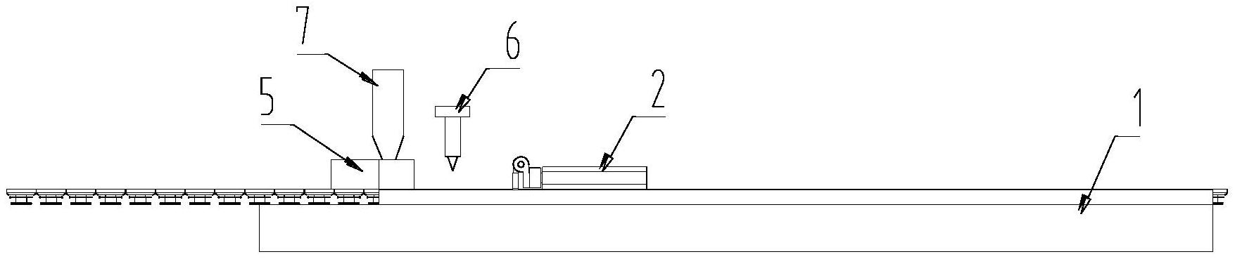 本实用新型涉及机械制造技术领域,公开了一种白板磁钉自动套料装置,包括机座,所述机座开设有进料槽,所述机座设有推送气缸、落料座,所述推送气缸活塞杆固定有推送板一,所述推送板一铰接有推送板二,所述推送板二固定有推送部,所述推动部位于所述进料槽内,所述落料座位于所述送料座上方,所述落料座开设有落料孔。本实用新型具有以下优点和效果:本实用新型通过推送气缸、推送板一、推送板二、推送部,对进料槽内的磁钉基座向前推动,点胶机对磁钉基座进行点胶,落料座内的磁铁向下掉落到磁钉基座上端凹槽内,完成自动套料,生产效率高。