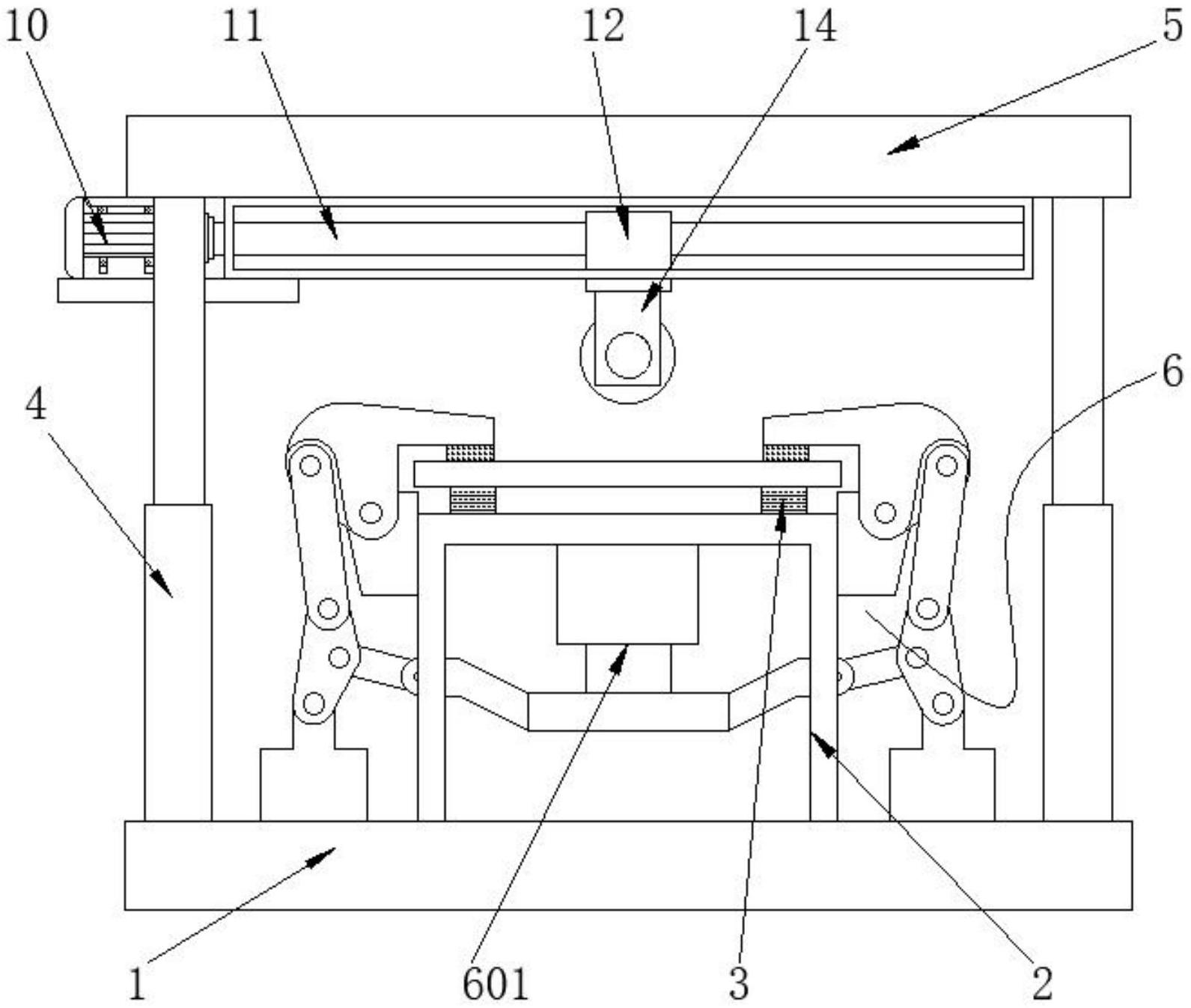 本实用新型公开了一种玻璃直线斜边机用玻璃夹持机构,包括底座和固定连接在底座顶端的工作台,所述工作台的顶端固定连接有橡胶垫,所述底座的顶端且远离工作台的两侧均固定连接有第一液压杆,本实用新型涉及玻璃加工技术领域。该玻璃直线斜边机用玻璃夹持机构,通过在工作台与底板的顶部设置夹持机构,第二液压杆通过气缸带动伸缩杆收缩配合驱动板,通过驱动板配合两侧的驱动块,从而带动连接板配合传动块,使传动块在固定块的顶端转动,同时通过配合传动条带动夹持块,使夹持块通过配合支撑块使一端下压,从而与玻璃的表面接触,由此来将玻璃进行夹持固定,使玻璃在加工时更加稳固,有效的提高磨边的精确度。
