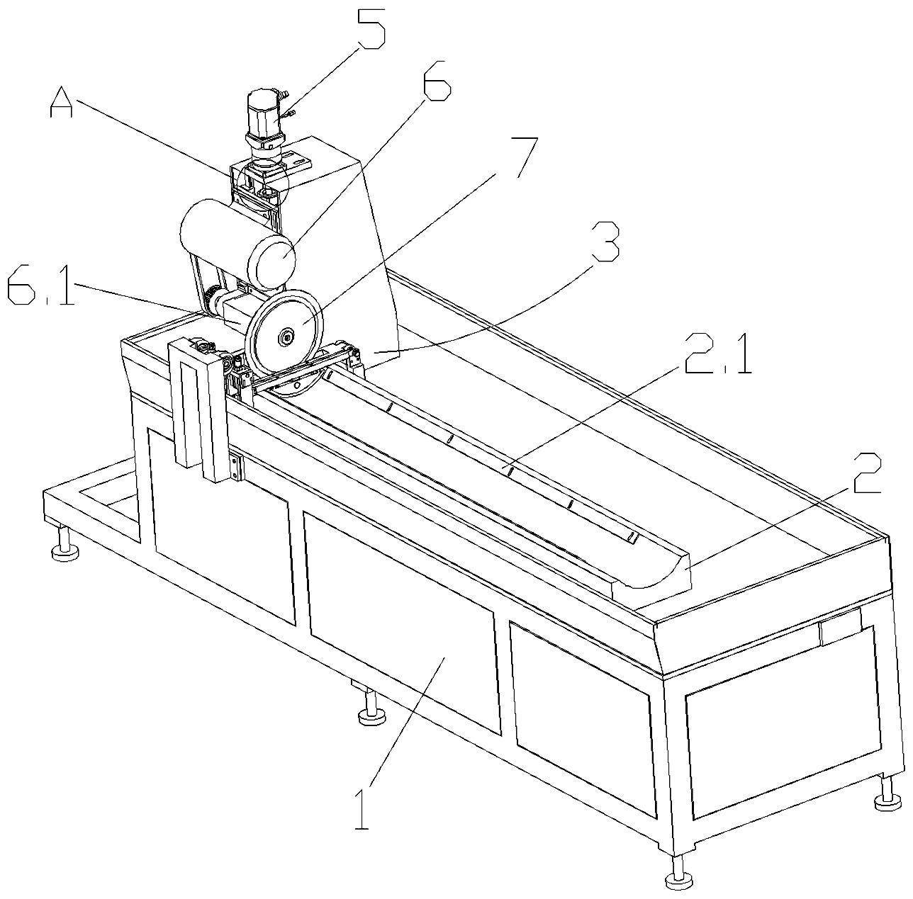 本实用新型公开了玻璃管切割机的切割装置,包括机架,在机架上设置放置板,在机架上设置固定底座,在固定底座的侧面滑动连接安装板,在固定底座上设置用于驱动所述安装板上下运动的第一驱动装置,在安装板上设置第二驱动装置,第二驱动装置驱动连接切割刀,切割刀对应设置在所述放置板的上方,在机架上还设置压紧装置,压紧装置对应设置在所述放置板的一侧。本实用新型的优点:本装置将一组玻璃管放置在放置板上,通过第一驱动装置能够带动切割刀一次性将多个玻璃管切断,提高了玻璃管的生产效率。