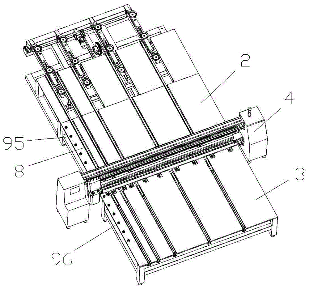 本实用新型涉及一种用于夹胶玻璃切割机的玻璃分离装置,包括对应设置的传片装置和下片装置,在传片装置和下片装置之间的切割装置,在切割装置上设有第三气缸,第三气缸通过刀板连接隔膜切割刀;在上侧横梁的下方安装压板装置,在下片装置的一侧安装分离吸盘装置,分离吸盘装置设置在所述传片装置和下片装置之间。本实用新型的优点:本装置用于夹胶玻璃切割的切割装置,当中间隔胶层两侧的玻璃被切割后,通过本装置把中间隔胶层分割,将玻璃分开,有效避免了人工切割会出现报废的状况,降低了玻璃切割报废的概率,减小了玻璃切割的成本的问题。