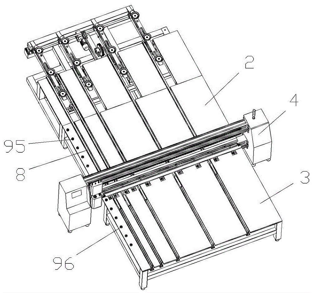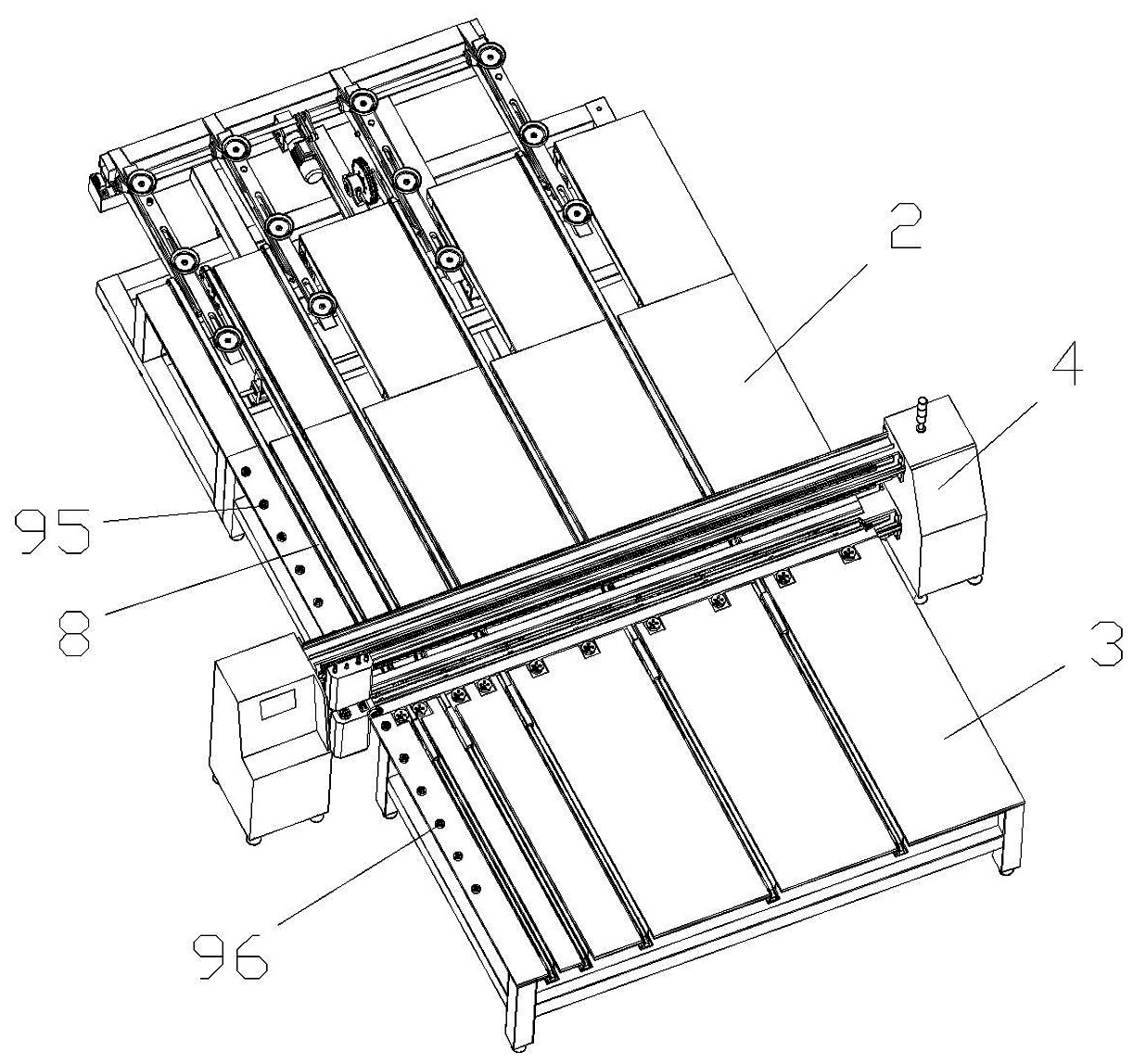 本实用新型涉及一种用于夹胶玻璃切割机的玻璃切割装置,包括对应设置的传片装置和下片装置,在传片装置和下片装置之间的切割装置;所述切割装置包括设置在传片装置两侧的立柱,在两个立柱之间连接两个横梁,两个横梁共竖直面平行设置,且两个横梁分别设置在传片架的上侧和下侧,在每个横梁上均连接第一滑轨,在上侧的第一滑轨上滑动连接上切割刀组件,在下侧的第一滑轨上滑动连接下切割刀组件,上切割刀组件和下切割刀组件对应设置。本实用新型的优点:本装置把玻璃传送到切割位置,通过切割装置对玻璃进行切割,切割完成后自动掰片,对玻璃进行加热、分离和划胶,解决了现有切割机在对玻璃进行切割时,无法实现全自动的切割和划胶,导致加工效率低的问题。