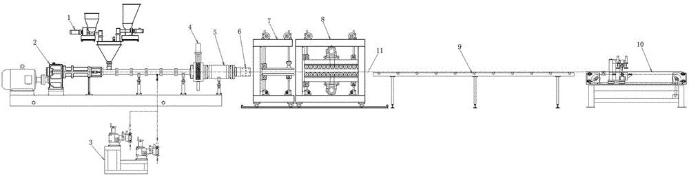 本实用新型涉及的是高分子材料加工领域,尤其是涉及一种聚亚苯基砜物理发泡片材的生产系统。包括喂料机、双螺杆塑料挤出机、发泡剂注入装置、换网器、换热器、挤出模头、整平机、压辊机、冷却装置和切割机;喂料机安装在双螺杆塑料挤出机一侧,通过喂料机给双螺杆塑料挤出机定量加料;发泡剂注入装置安装在双螺杆塑料挤出机的机筒一侧,通过发泡剂输送管道给双螺杆塑料挤出机定量加发泡剂;双螺杆塑料挤出机的前端装有换网器;换热器安装在换网器前端部;挤出模头安装在换热器前端料流管料流出口端;整平机前部装有压辊机,冷却装置前部安装备有切割机,通过切割机进行切割后,包装得到聚亚苯基砜物理发泡片材成品。