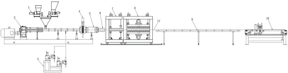 本实用新型一种聚亚苯基砜物理发泡片材生产系统的喂料机涉及的是高分子材料加工领域,适用于聚亚苯基砜(PPSU)物理发泡片材生产系统配套使用。包括喂料机机架、送料筒、喂料电机、喂料螺杆、喂料机料斗、计重秤和下料管;送料筒安装在喂料机机架上,喂料螺杆安装在喂料送料筒中,喂料电机安装在送料筒一端,喂料电机通过连轴节与喂料螺杆相连,送料筒上部装有喂料机料斗,喂料机料斗出料口与送料筒相连通,送料筒出口通过下料管与双螺杆塑料挤出机进料斗相通。喂料机安装在双螺杆塑料挤出机一侧,喂料机的送料筒出口通过下料管与双螺杆塑料挤出机进料斗相通,通过喂料机给双螺杆塑料挤出机定量加料。