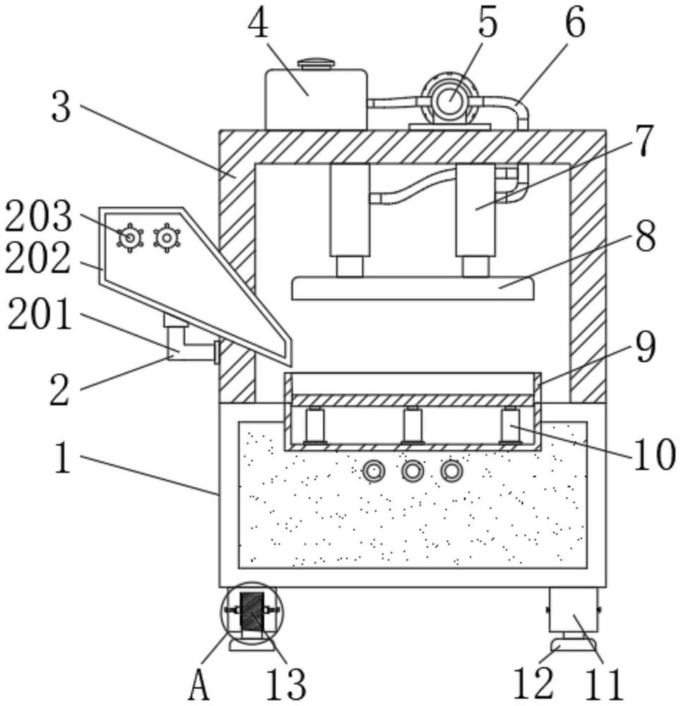 本实用新型公开了一种用熔融高炉渣生产岩棉装置,包括柜体、固定架、油缸和增压泵,所述柜体的顶端固定有固定架,所述放置槽均设置于固定套内部的两侧,所述固定螺纹均设置于固定套内部的两侧。本实用新型通过设置有调节结构实现了便于调节装置的高度,当需要对装置进行调整高度时,顺时针拧动支撑脚,支撑脚带动螺纹柱进行转动,螺纹柱因固定螺纹的作用从固定套的内部旋出,当调整好伸出的长度后对螺纹柱进行固定,将两侧的固定螺母向内部转动,固定螺母与放置槽配合使固定推块向前推动螺纹柱,两侧的夹持使螺纹柱与固定套之间固定住,进而固定套与支撑脚之间也固定住,从而提高了使用的多样性。
