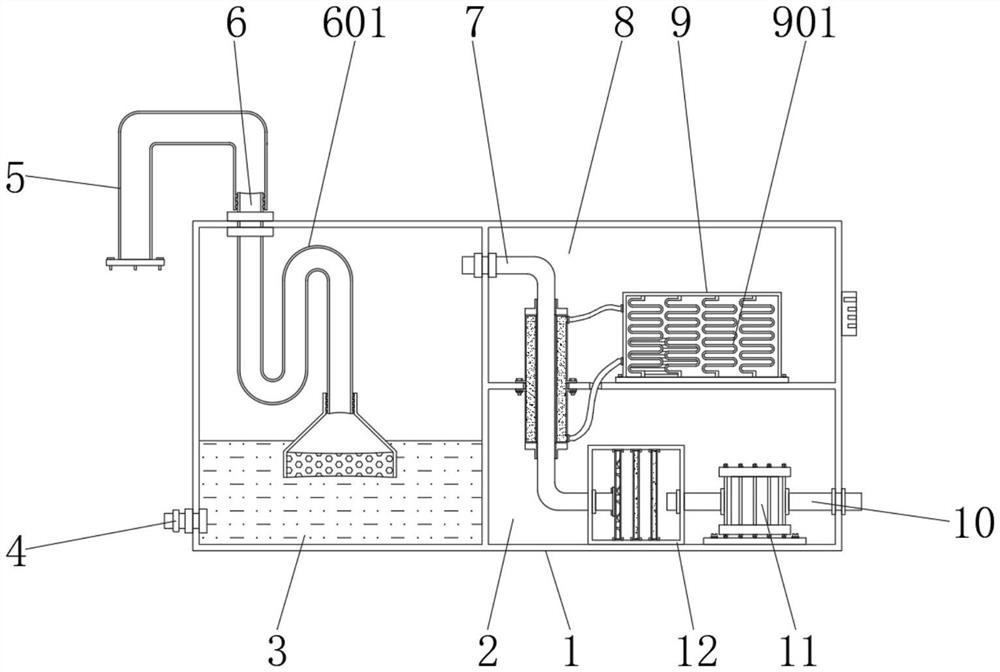 本实用新型公开了一种岩棉生产用烟气处理设备,包括主体框架、过滤室、稀释舱和排料口,所述主体框架内部一侧的下方设置有过滤室,所述主体框架内部的另一侧设置有稀释舱,所述稀释舱的一侧设置有排料口,所述过滤室内部底端的另一侧固定连接有过滤结构。本实用新型通过设置有气液分离机构实现了对烟气的冷凝处理,启动冷凝器使其内部产生低温冷空气并通过输入管进入热传递槽内部,使冷凝管内部温度快速降低,使烟气输送管内部烟气在移动至冷凝管内部后,烟气中含有的水分受到低温影响开始由烟雾状转变成液态水滴,且水滴会将烟气中的固体颗粒包裹,使烟气中气体从中脱离,从而使烟气中的固、液进行分离。