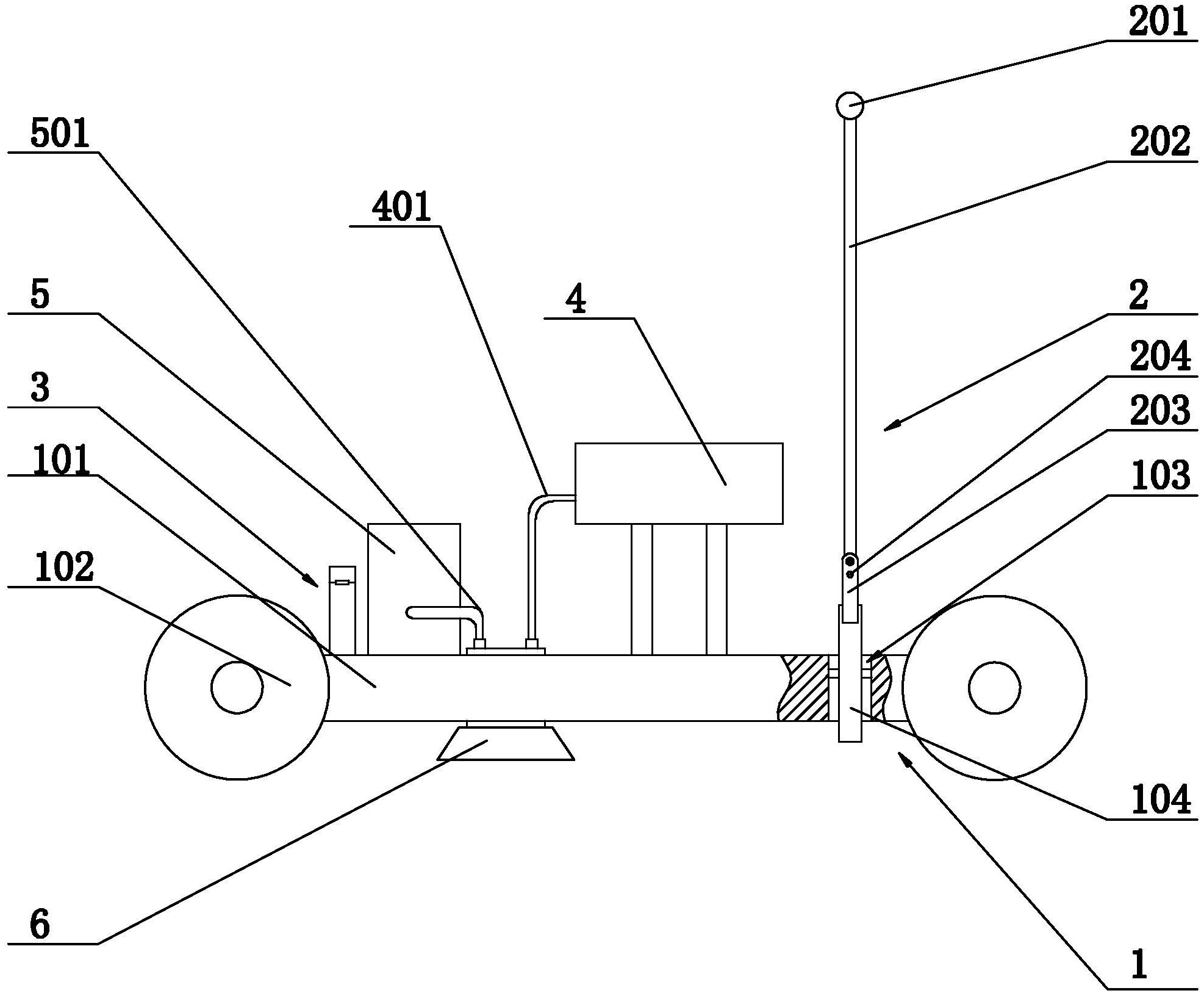 本实用新型涉及一种彩钢瓦的修缮喷漆机,包括车体、设于车体上的喷漆装置,车体的底盘上设有可以改变朝向的扶手;底盘的后端设有长条形的贯通槽,转盘可转动的竖直安装于贯通槽,贯通槽的内部的前后两侧面均设有同轴的第一插销孔,转盘对应第一插销孔设有周向分布的多个第二插销孔;插销穿过第一插销孔并通过某个第二插销孔以固定转盘的转动角度;扶手包括水平的扶手杆和两根连接杆;连接杆的一端与扶手杆固定连接,其另一端固定连接于转盘;本实用新型提供的一种彩钢瓦的修缮喷漆机,与现有技术相比:底盘上的转盘可以旋转并且通过插销固定其旋转角度,从而使工作人员可以调整扶手的角度,实现使工作人员从所述车体的侧边推动所述车体前进。