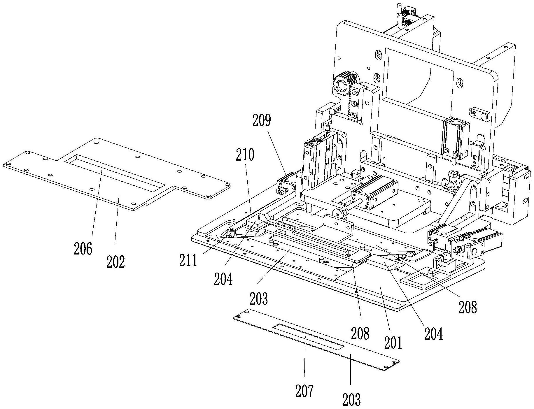 本实用新型公开一种电磁铁吸附折边定位结构,包括有外压框,其设置有上下贯通的第一通孔;外压框上安装有折边校位机构,折边校位机构包括有校位边框和驱动校位边框张合的驱动单元;上压板,其位于外压框的上方,且遮盖于校位边框的上方;上压板设置有上下贯通的第二通孔,第二通孔与第一通孔对应设置;下压板,其对应第一通孔设置且位于校位边框的下方,下压板设置有上下贯通的第三通孔;电磁铁,其设置于外压框上,电磁铁位于下压板的上方;当电磁铁通电产生磁力,下压板在电磁铁的吸力作用下向上位移,当电磁铁断电磁力则消失,下压板在自身重力作用下往下掉落一设定距离。其结构简单,结合电磁铁吸住下压板上抵定位,可靠性佳。