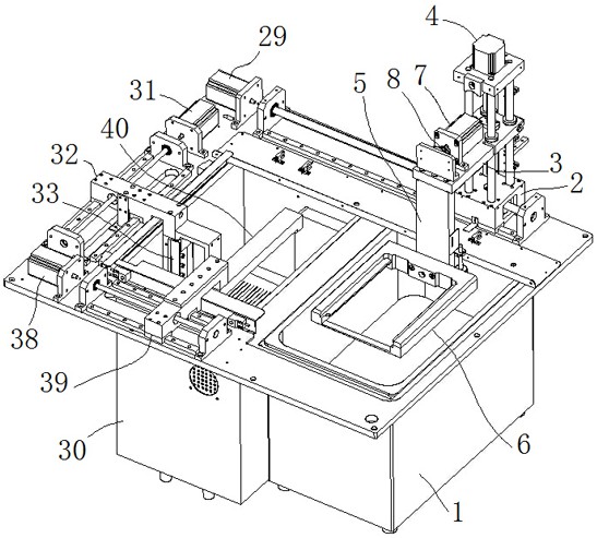 本实用新型涉及贴片机吸嘴技术领域,特指一种全自动SMT吸嘴清洗机;本实用新型机身内安装有台面,台面下方安装有清洁箱、冲洗箱,冲洗箱与清洁箱并排安装;清洁箱配有超声波发生器;台面上安装有可升降、可平移的托盘支架,冲洗箱内部配设有可平移的冲头,冲头上具有多个冲嘴,台面上还安装有可平移的吹风头;本实用新型通过超声波发生器工作,使吸嘴浸入液体内通过超声波清洁,然后将吸嘴移动到冲洗箱内进行冲洗,最后将水吹干,能够实现全自动操作,清洁效率高、清洁效果好。