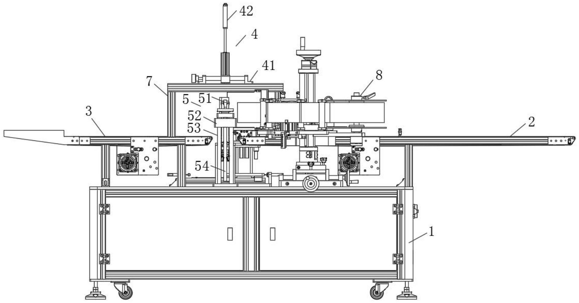 本实用新型公开了全自动立式方瓶专用贴标机,包括支撑台,支撑台上端两侧分别固定有进料架和出料架,进料架和出料架之间设有旋转台,旋转台与支撑台转动连接,旋转台一侧设有覆标机构,旋转台正上方设有安装架,安装架与支撑台固定连接,安装架上设有挤压机构,挤压机构与旋转台相对应,进料架两侧分别设有贴标机组和取料机构,贴标机组一端位于旋转台和覆标机构之间,本实用新型使整个贴标过程中能够全自动完成,节约人力物力,提升贴标效率,同时,在贴标过程中能够很好的保证方瓶的稳定性,从而保证贴标的精准性。