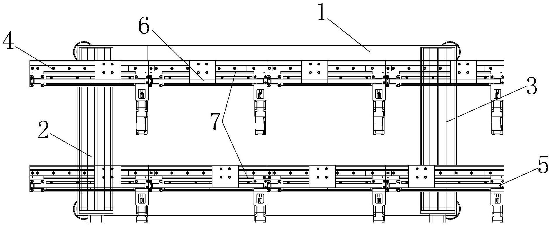 本实用新型公开了一种易于组装的柔性环形工作台,包括承载台,所述承载台上端固定安装有第一平移模组和第二平移模组,所述第一平移模组和第二平移模组上端活动安装有第一双面齿变轨模组和第二双面齿变轨模组,所述第一双面齿变轨模组上端活动设置有滑座,所述承载台上端固定安装有对称的双面齿传输模组,所述承载台下端四角边缘处固定安装有支撑腿,所述滑座下端固定安装有固定柱,所述固定柱外壁固定安装有齿轮环。本实用新型通过设置第一平移模组、第二平移模组、第一双面齿变轨模组、第二双面齿变轨模组和滑座,利于物体的搬运工作,通过配合使用各个模组,实现了将滑座环形移动的效果,实现了载具的循环使用,使用方便。