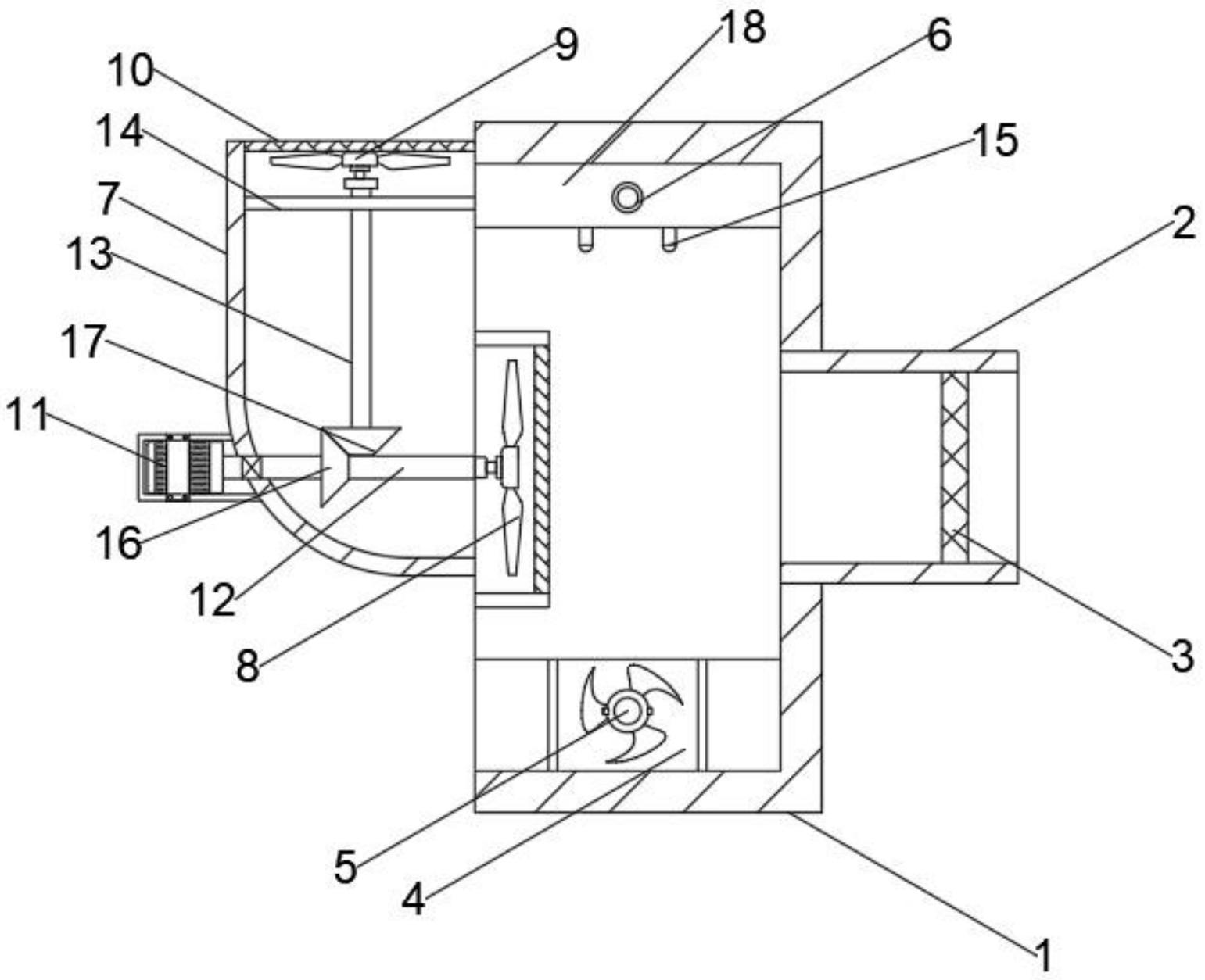本实用新型公开了一种水泥加工用通风除尘装置,包括箱体,箱体内部的一侧设有第一风扇,第一风扇中心轴的一侧连接有第一驱动杆,箱体内部的顶端设有水箱,水箱的底端设有若干雾化喷头,且雾化喷头的一端贯穿水箱的底端,箱体内部的底端设有出料槽,出料槽贯穿箱体的一侧,且出料槽的内部安装有螺旋杆,箱体的一侧设有进气口,且箱体在远离进气口的一侧设有通风管,通风管的内部设有第二风扇,且第二风扇中心轴的一侧连接有第二驱动杆。该种水泥加工用通风除尘装置,结构简单合理,设计新颖,操作简单便捷,能有效将水泥加工过程中产生的灰尘去除,且便于加工室的通风,具有较高的实用价值。