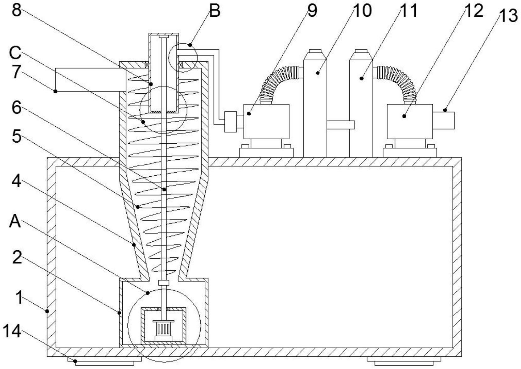 本实用新型公开了一种废气脱硫脱硝除尘一体机,包括工作箱,工作箱内部安装有旋风分离塔,且旋风分离塔顶部穿过工作箱,旋风分离塔的顶部一侧连接有进气管,旋风分离塔的内部安装有导向管,导向管的内部竖直安装有转轴,且转轴外侧套装有螺旋叶片,转轴的底部连接有电机,且电机与转轴传动连接,电机的外侧套装有壳体,旋风分离塔底部安装有灰斗箱,且壳体安装在灰斗箱内部,旋风分离塔与灰斗箱之间设有通孔,且转轴穿过通孔;该种废气脱硫脱硝除尘一体机,可以使废气中的粉尘进行快速分离,然后再进行脱硫脱硝,结构简单合理,具有较高的实用性,便于广泛推广使用。