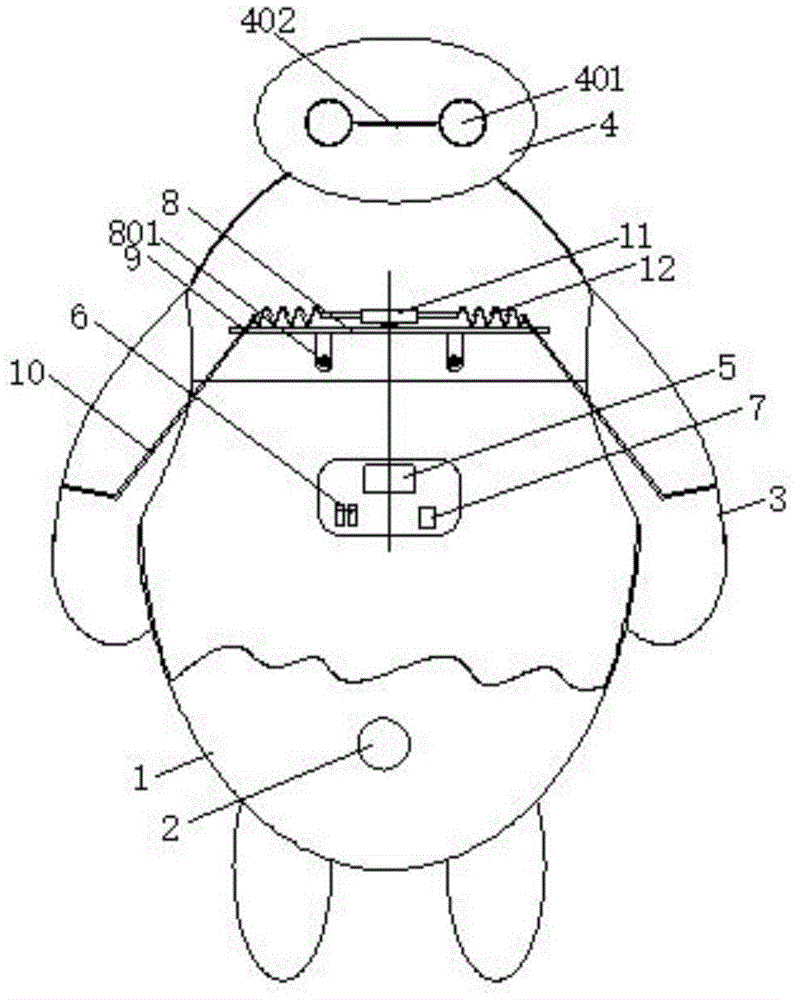 本实用新型公开了一种可保护儿童的毛绒玩具,包括玩具躯体,所述玩具躯体的下端表面设有检测器,所述玩具躯体的左右两侧设有臂囊,所述玩具躯体的上端设有头部,所述头部的上表面设有闪灯,所述玩具躯体的内腔中部设有隔离罩,本可保护儿童的毛绒玩具,保持毛绒玩具固有的柔软特性,通过双向电动伸缩杆可带动臂囊摆动,配合闪灯和扬声器的互动可吸引儿童的注意力,通过检测器可对儿童的距离进行检测,若距离过大,则通过声、光以及肢体互动吸引儿童的注意力,使儿童处在毛绒玩具的周围,远离容易产生危险的物品,从而对儿童起到保护作用,若儿童超出范围,则向监护人发出警告,一定程度上降低了监护人的监护力度。