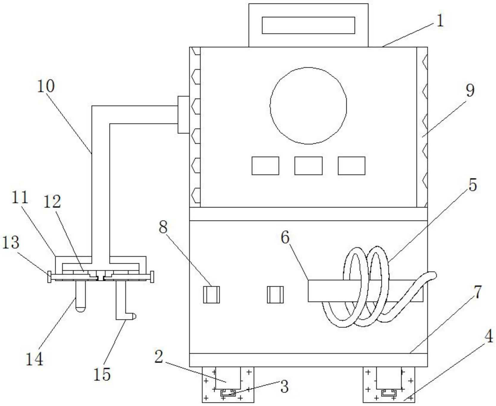 本实用新型公开了一种便于连接的车载充气泵,包括充气泵和充气管,所述充气泵的底端安装有支撑腿,所述支撑腿的底端设有限定件,所述限定件卡合安装在缓冲垫的限定槽内,所述缓冲垫位于支撑腿的外端,所述充气泵的右端连接有电源线,所述电源线的末端缠绕在绕线杆上,所述收线盒位于充气泵的底部,所述充气泵的外侧开设有透气孔,所述充气泵的左侧连接有充气管,所述充气管的末端连接有调节盘,所述调节盘的内部等间距开设有充气孔,所述充气孔的内部卡合安装有插片,所述充气孔外端连接有第一充气头和第二充气头。该便于连接的车载充气泵,利用缓冲垫减缓充气泵工作时产生的振动,提高稳定性,便于连接使用不同类型的充气头。