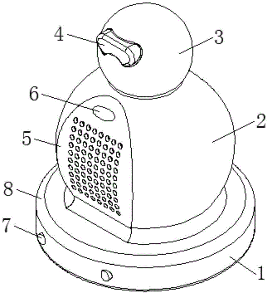 本实用新型公开了一种宝贝看护型毛绒玩具,包括底盘、身体和头部,所述底盘为圆形盘状结构,且底盘上方中间位置固定设置身体,所述身体顶部固定配合安装头部,所述头部的前端表面固定设置摄像头安装座,所述摄像头安装座内部水平并列布置两个摄像头,所述身体的前后两侧分别设置安装板,所述安装板表面均匀设置扩音孔,且安装板内部固定设置扬声器,所述底盘的下表面后端并列设置两个滚轮安装孔,本宝贝看护型毛绒玩具内部集成摄像头、拾音器和扬声器,能够对幼儿进行图像和音频的采集,同时结合无线信号收发器,能够实现远程监控和语音聊天,从而实现远程看护。
