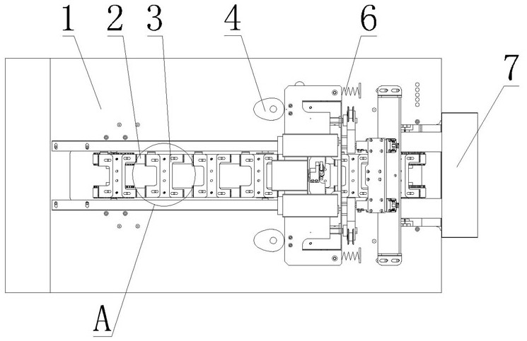 本实用新型公开了口罩点焊机,包括机架,在所述机架上设置有口罩输送带,其特征在于:在所述机架上设置有移动座,在所述机架上设置可驱动凸轮,所述驱动凸轮与转动驱动组件连接,所述驱动凸轮与所述移动座的一侧相抵,所述移动座的另一侧紧压有复位弹簧,所述移动座上设置有耳带放卷组件和耳带焊接组件,在所述移动座的后侧依次设置有耳带剪断组件和口罩下料斗。本实用新型结构简单,设计合理,能够有效提高口罩耳带的点焊时间,进而提升其点焊的质量,同时又可以保证口罩的不间断持续输送点焊,提升口罩耳带的点焊效率。