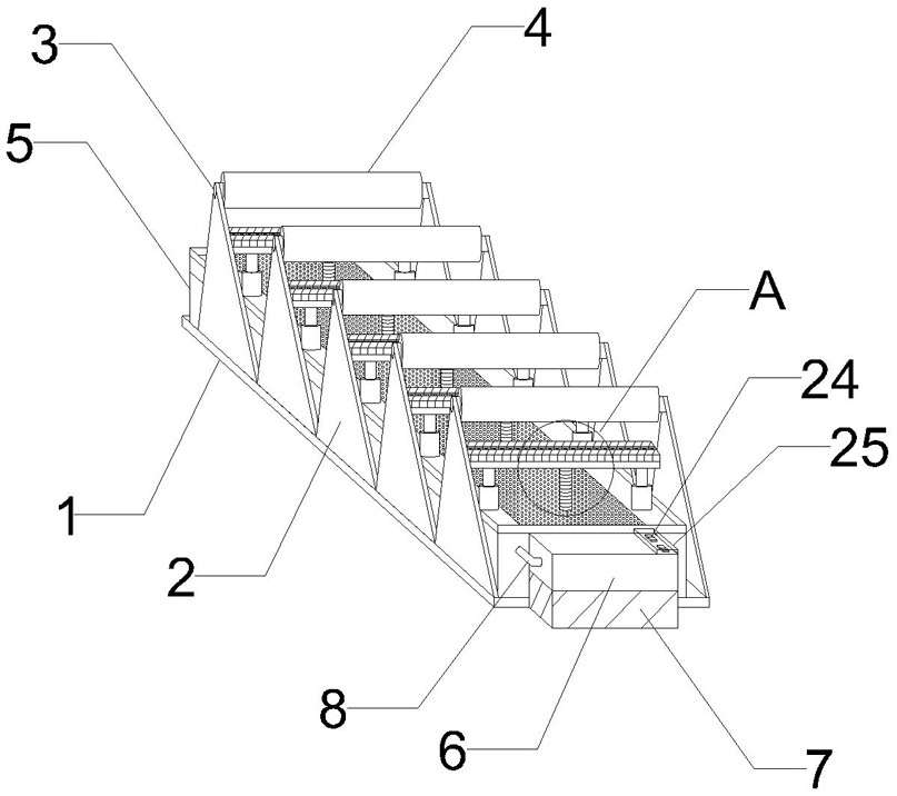 本实用新型公开了纸袋机的清理装置,包括机底座、装置底座,所述机底座两边装有支撑板,所述支撑板顶部通过转动轴与转动辊相连接,所述机底座顶部与装置底座底部相连接,所述装置底座一端与控制台相连接,所述控制台底部安装有电源室,所述控制台两端均接有控制线,所述控制线另一端延申进电机隔层与伸缩电机一端相连接,该装置通过伸缩杆伸缩使清洁板上升,通过清洁板上升使清洁板紧贴转动辊表层,通过抽水泵抽出蓄水池内水,在通过抽水管导入喷水头再由喷水头喷洒在转动辊上,在启动纸袋机使转动辊在清洁层上转动来达到清洁的效果,这样一套自动清洁的装置很好的对转动辊进行清理,防止转动辊上因积累脏物对纸袋制作的质量造成影响。
