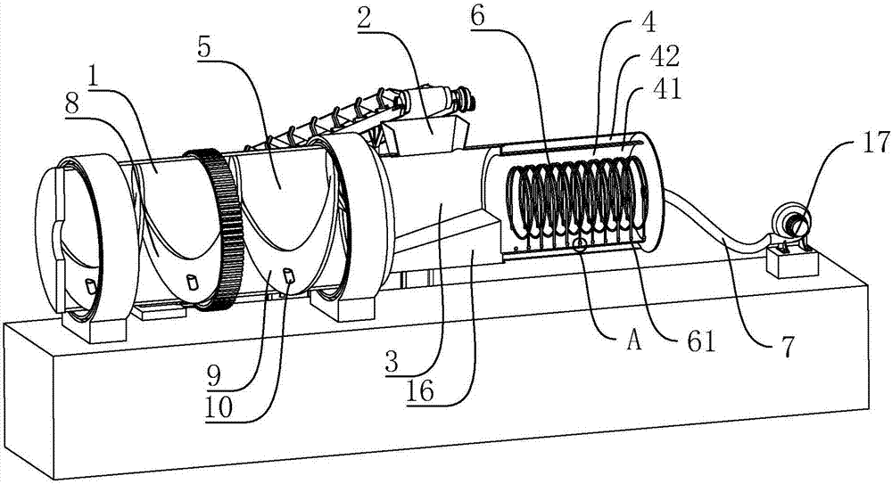 本实用新型公开了一种烘砂加热装置,其技术方案要点是包括同轴连接的加热筒、连接筒和烘砂筒,所述加热筒中设置有若干加热丝,每根所述加热丝均卷绕成圆形,所述加热丝自加热筒中引出,与电源连接;所述加热筒背离连接筒的一端设置风机,风机的出风口采用风管与加热筒相连。通过采用上述技术方案,加热丝通电发热时,启动风机,风机通过风管向加热筒内输入气流,气流经过加热丝时,与加热丝发生热交换,携带热能,这种带有热能的气流经过连接筒导入烘砂筒中,由于气流的分散性好,故而烘砂筒的中砂石能够大面积的与气流热气流接触,热气流在分散的过程中,使得砂石处处受热都能够近似相等,提高砂石受热均匀度。