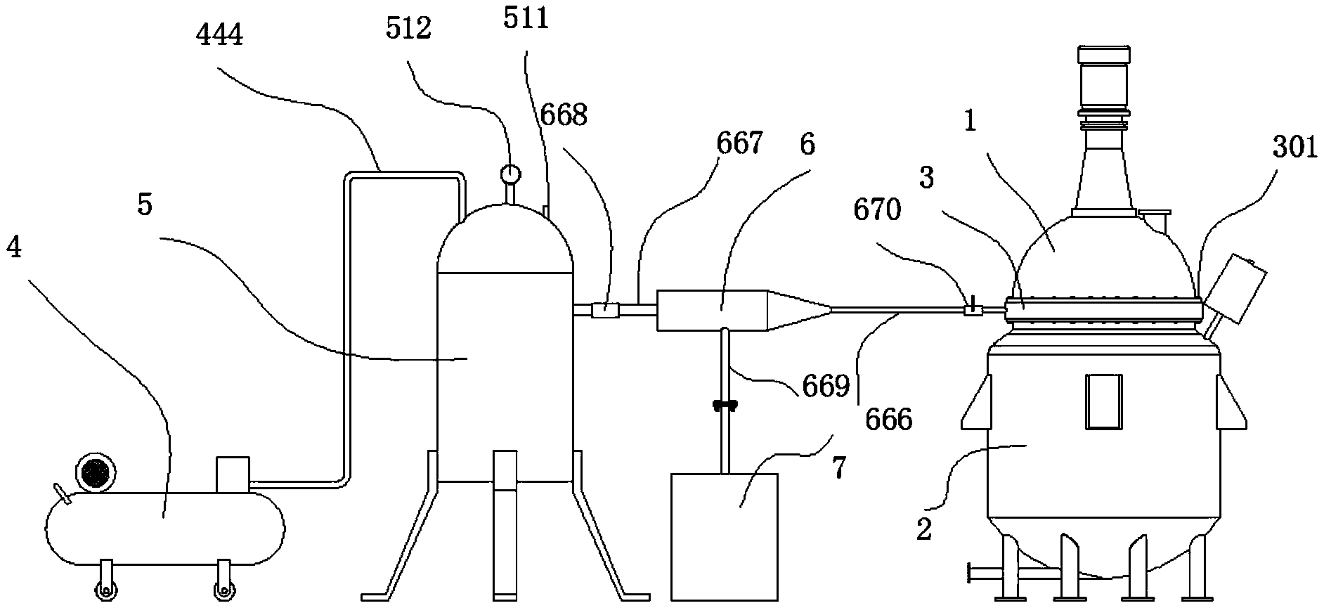 本实用新型公开了一种高性能减水剂液料反应釜清洗装置,包括固定于釜体和釜盖之间的环形的分流盒,还包括空气压缩器、空气增压罐、高速混合室和储液罐,其特征在于:所述分流盒分别与所述釜体和釜该之间配合有螺丝,所述分流盒具有上、下两个平行的平面,在所述平面上环形分布有竖向设置的喷淋孔,该喷淋孔的孔径为0.4mm~0.65mm,在所述分流盒的内侧设置有两个呈上、下对称设置的斜面,两个斜面之间所形成的夹角角度为15~30°,在所述斜面上环形分布有第一喷淋孔,所述第一喷淋孔垂直于所述斜面,所述第一喷淋孔的孔径为0.4mm~0.65mm;本产品可以与反应釜之间固定安装,并且可以对反应釜的内部进行高压冲洗。