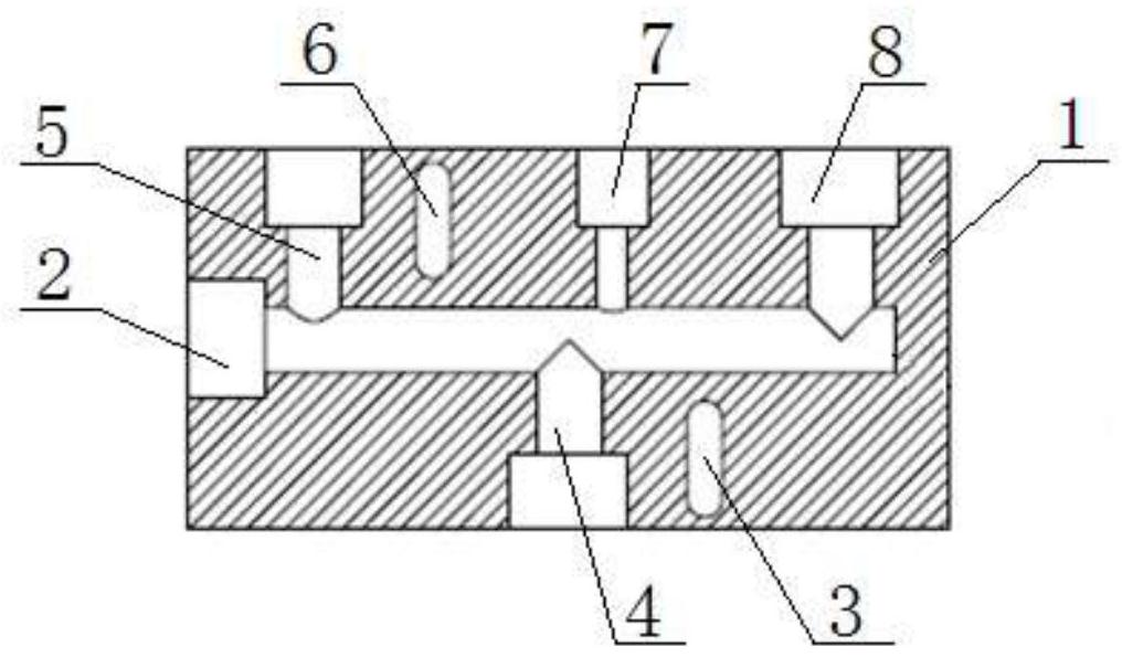 本实用新型提供了一种冷媒充注机管路集成块,包括本体、设置在本体一端的沉头孔一、设置在本体底端的沉头孔二,沉头孔二与沉头孔一连通,沉头孔一为盲孔;本体的顶部从一端到另一端依次设置有沉头孔三、沉头孔四和沉头孔五,沉头孔三、沉头孔四和沉头孔五均与沉头孔一连通;本体的侧部还设置有中心孔,中心孔与沉头孔一连通;本体的两侧设置有固定孔一和固定孔二,固定孔一和固定孔二中分别设置有定位件。本实用新型提供的冷媒充注机管路集成块,能够简化多种零件的连接结构,通过设置有管路集成块,将多个零件设置在管路集成块上,可有效减少管路的连接长度,节省了空间。