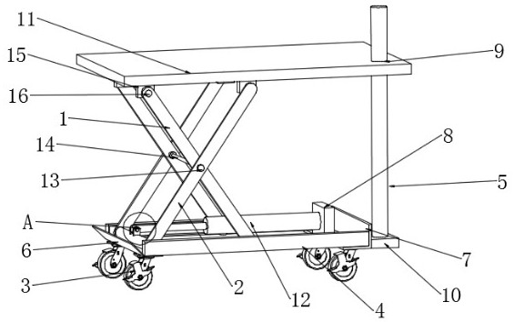 本实用新型公开了铸型碲加工技术领域的一种铸型碲出料装置,包括第一连杆和第二连杆,第一连杆上转动连接有第一连接轴,第一连接轴上转动连接有第二连杆,第一连杆和第二连杆的上端均转动连接有第二连接轴,第二连接轴的一端固定连接有活动块,活动块的上端滑动连接有支撑板,第一连杆的下端转动连接有第一固定轴,第一固定轴远离第一连杆的一端固定连接有第一滑块,第二连杆的下端转动连接有第二固定轴,第二固定轴远离第二连杆的一端固定连接有第二滑块,第一连接轴之间固定连接有连接杆,本实用新型方便用户手动精准控制平台高度,使熔融碲液与模具之间的高度差恰到好处,采用液压升降装置,稳定升降幅度,避免操作过程中平台摇晃。