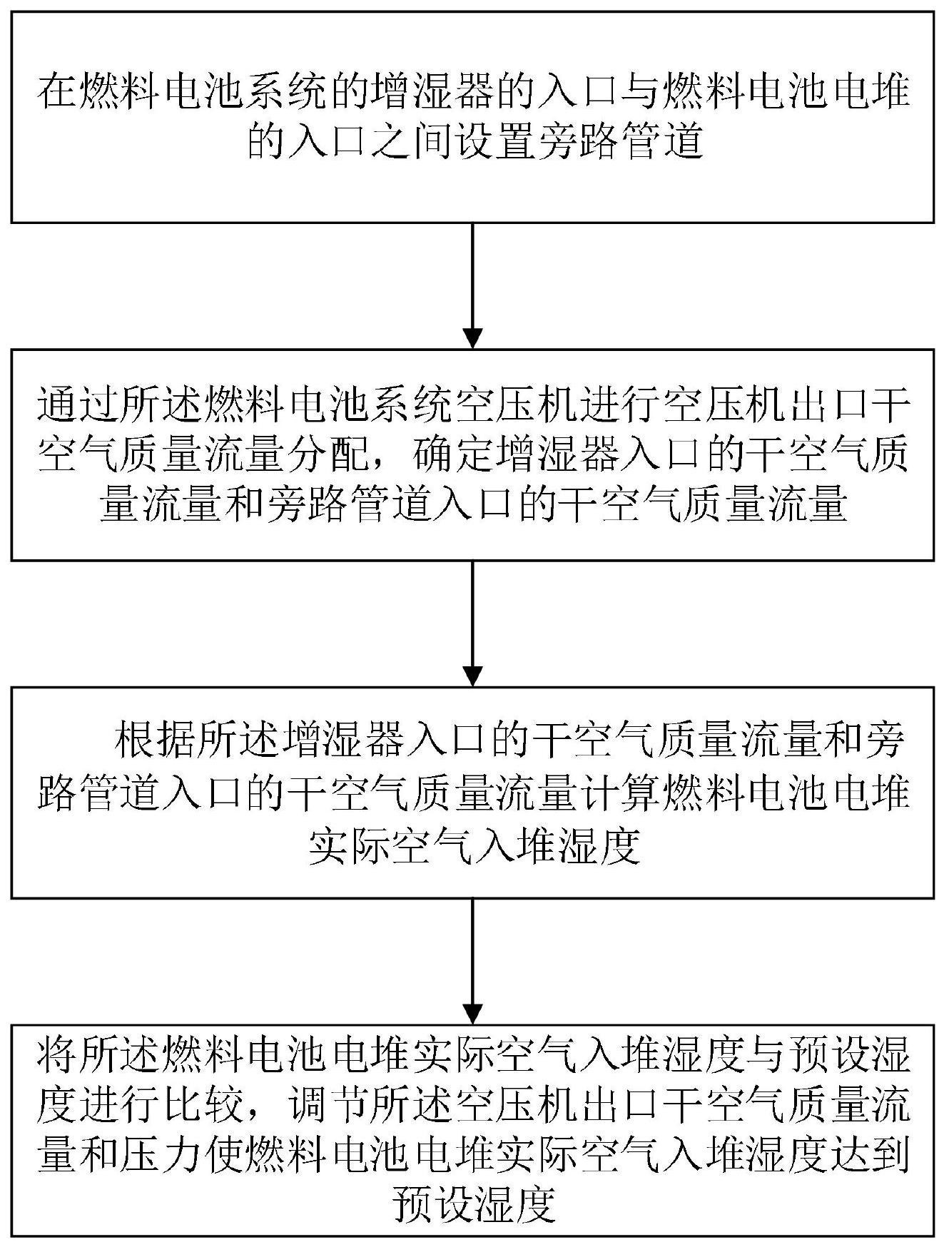本申请提供一种燃料电池系统空气入堆湿度的控制方法及系统,包括:在燃料电池系统的增湿器的入口与燃料电池电堆的入口之间设置旁路管道;通过燃料电池系统空压机进行空压机出口干空气质量流量分配,确定增湿器入口的干空气质量流量和旁路管道入口的干空气质量流量;根据增湿器入口的干空气质量流量和旁路管道入口的干空气质量流量计算燃料电池电堆实际空气入堆湿度;将燃料电池电堆实际空气入堆湿度与预设湿度进行比较,调节所述空压机出口干空气质量流量和压力使燃料电池电堆实际空气入堆湿度达到预设湿度。本申请通过调整空压机的转速和压缩比,使燃料电池电堆实际入堆湿度与预设湿度相同,实现对入堆湿度的精准控制。