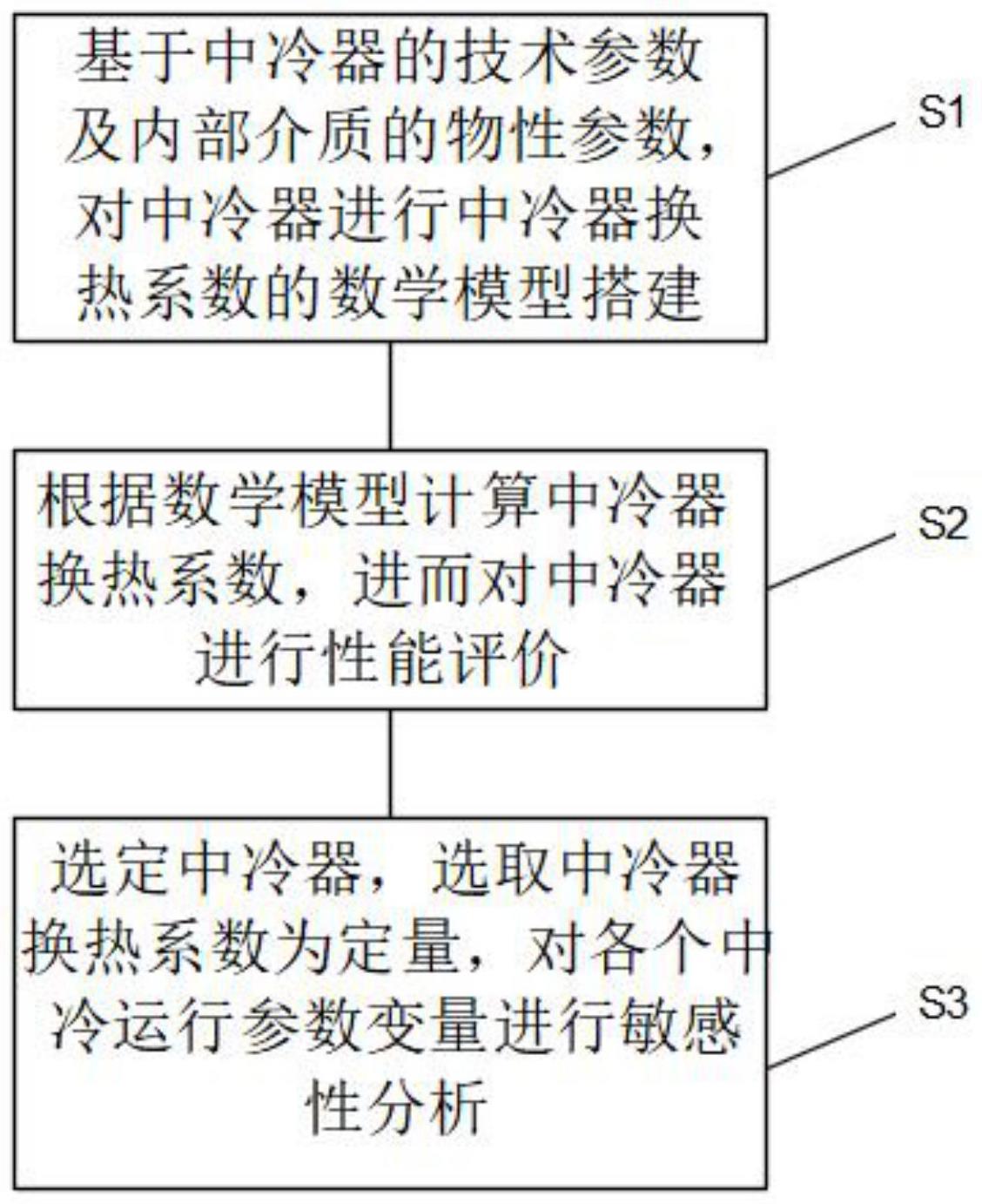 本发明公开了一种燃料电池系统中冷器的评价方法,包括S1、基于中冷器的技术参数及内部介质的物性参数,对中冷器进行中冷器换热系数的数学模型搭建;S2、根据数学模型计算中冷器换热系数,进而对中冷器进行性能评价;S3、选定中冷器,选取中冷器换热系数为定量,对各个中冷运行参数变量进行敏感性分析。本发明首次基于换热模型,对中冷器搭建了中冷器换热系数数学模型,进而对中冷器进行性能评价,为燃料电池设计提供理论依据,而且将仿真数据与实际数据进行对比,误差很小,表明此数据模型可以应用于燃料电池系统设计中;并选取中冷器换热系数为定量,对其各个参数变量进行了敏感性数据分析,可在设计燃料电池系统时对其敏感性参数进行考虑。