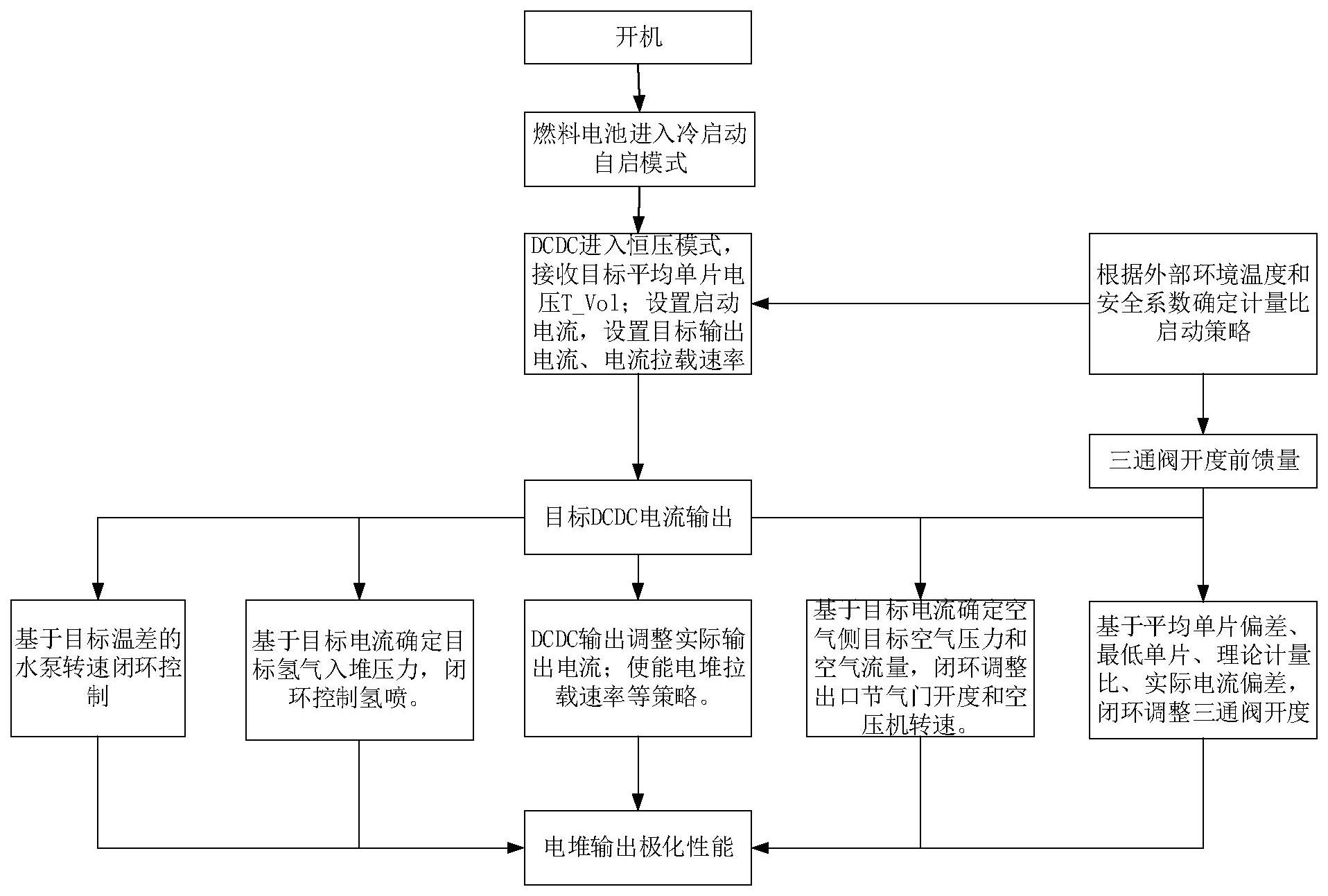 本发明提供了一种燃料电池低温自启动的控制方法,包括:基于电堆目标平均单片电压和气量比启动策略得到DCDC变换器输出目标电流;基于目标电流和获取的目标温差控制水泵转速;基于目标电流确定目标氢气入堆压力,闭环控制氢气路的氢喷;基于目标电流调整DCDC变换器的实际输出电流;基于目标电流确定目标空气压力和空气流量,闭环调整空气路上出口节气门和空压机转速,基于气量比启动策略得到空气路上三通阀开度前馈量,基于三通阀开度前馈量、目标电流、平均单片偏差、理论空气计量比和实际电流偏差闭环调整空气路上三通阀开度。解决由于电堆单片性能不一致和性能衰减等问题导致的在固定策略下低温冷启动易失败的问题,提高系统可靠性。