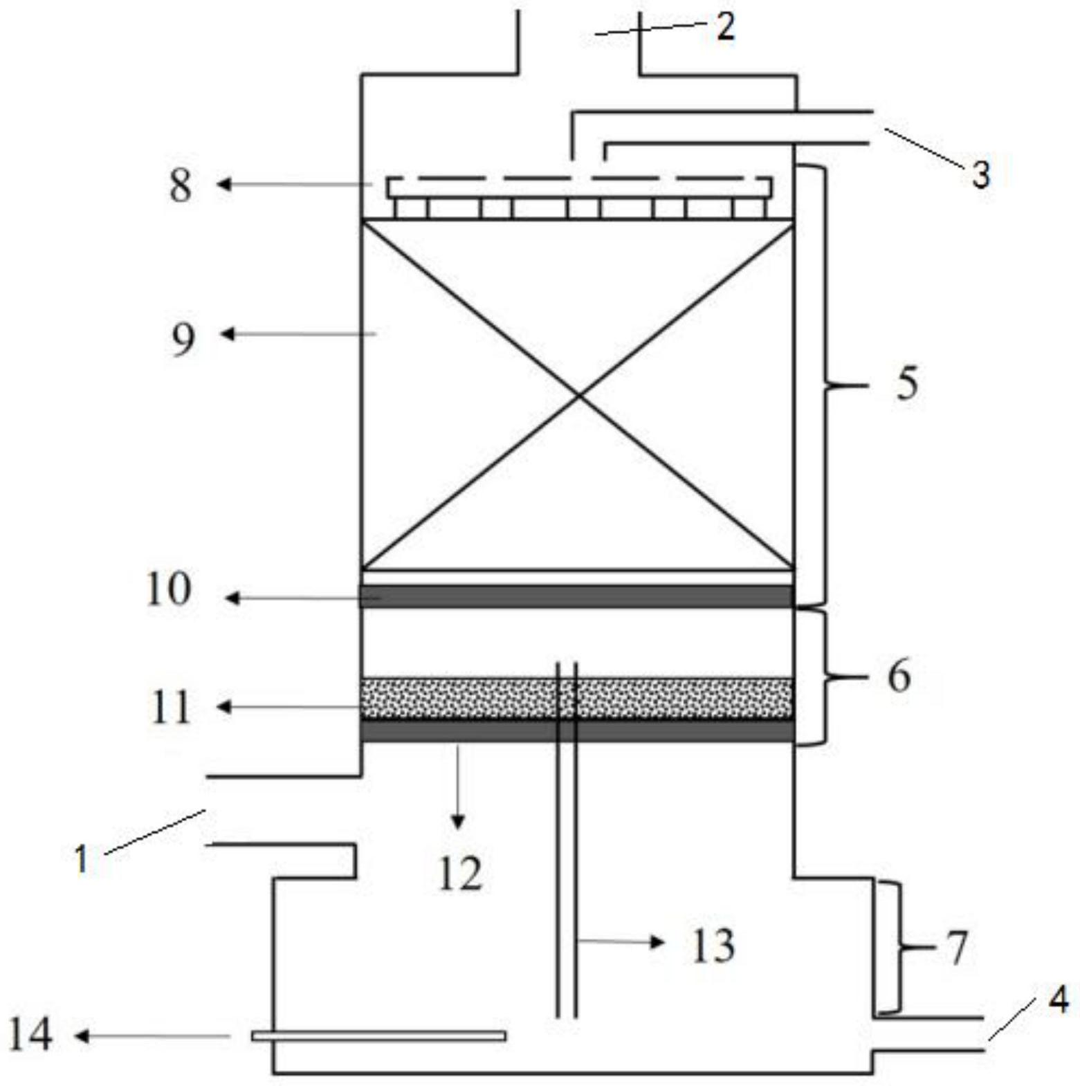 本发明公开一种大功率燃料电池测试台用增湿器,包括鼓泡增湿区、位于鼓泡增湿区上部的喷淋增湿区和位于鼓泡增湿区下部的储水区,所述鼓泡增湿区与喷淋增湿区之间留有空间,所述鼓泡增湿区的下部设有气体进口,所述喷淋增湿区的顶部设有气体出口与去离子水进口,所述储水区的底部设有去离子水出口,去离子水进口与去离子水出口之间通过外部管道连接。本发明采用鼓泡增湿和喷淋增湿相结合的方式,可达到良好的增湿效果,喷淋增湿区高比表面积填料,可实现高效增湿,同时防止液态水进入燃料电池;采用喷淋装置代替喷嘴,控制简单,成本低廉;本发明内部无转动部件,使用寿命长。