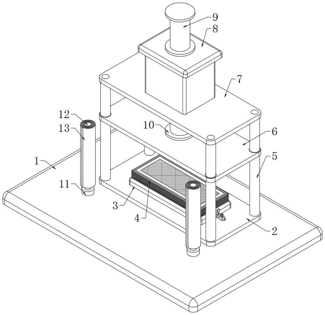 本实用新型公开了一种多膜电极气密性检测的装置,包括:检测平台,所述检测平台的上表面固定连接有支撑底板,所述支撑底板的上表面固定安装有下检测板,所述下检测板的上表面设置有膜电极组件,所述膜电极组件的顶端设置有上检测板;所述下检测板的一侧固定连接有进气管道,所述进气管道的一端固定安装有气阀,所述进气管道的另一端固定安装有气压表;所述支撑底板的上表面等距固定连接有多个立柱。该多膜电极气密性检测的装置,通过空气与氢气进行膜电极MEA的气密性检测,大大降低氢气与氧气混合,带来爆炸的风险,保证整体检测过程的安全,同时配合安全光栅进行防护,进一步提高装置的安全性。