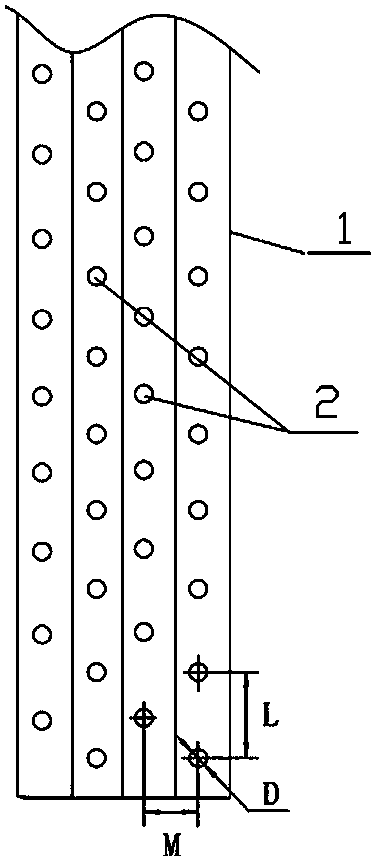本实用新型公开了一种钢化玻璃淬冷风栅,包括带有吹风板的风栅本体,在所述吹风板上开设有吹风孔;所述吹风孔的孔径D为3~5.5mm,同一排中相邻两吹风孔之间的间距L为10~25mm,相邻两排吹风孔之间的间距M为10~18mm。本实用新型的优点在于将常规风栅吹风板上开设的吹风孔的孔径和间距进行合理布置,精确调整,可使钢化玻璃时的实际风机风压值降至理论值的60%以下,颠覆了本领域技术人员的传统认知,大大降低了淬冷所需风机的功率,使风机效率得以大大提高,使用寿命加长。