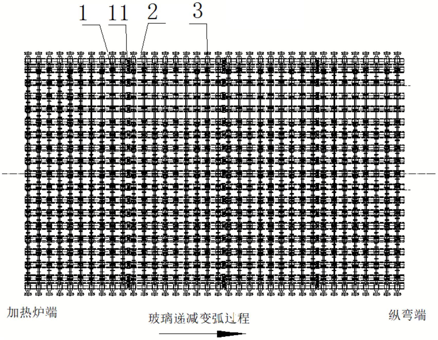 本实用新型公开了一种递减变形趋势的渐变成形辊台,包括成形辊台,所述成形辊台水平放置,所述成形辊台包括多个支撑梁组,所述多个支撑梁组横向平行放置且连线为弧形,所述支撑梁组包括多个支撑梁,所述多个支撑梁首位相接,所述首尾相邻支撑梁之间竖直设置有调节机构,所述调节机构位于支撑梁的下方,所述调节机构与支撑梁位于同一竖直面内且转动连接,所述两平行支撑梁之间的间隙内水平垂直转动连接有辊道组件,本实用新型的设置有效解决了小半径长弯玻璃边部的折角问题,本实用新型解决弯玻璃边部的折角的问题。