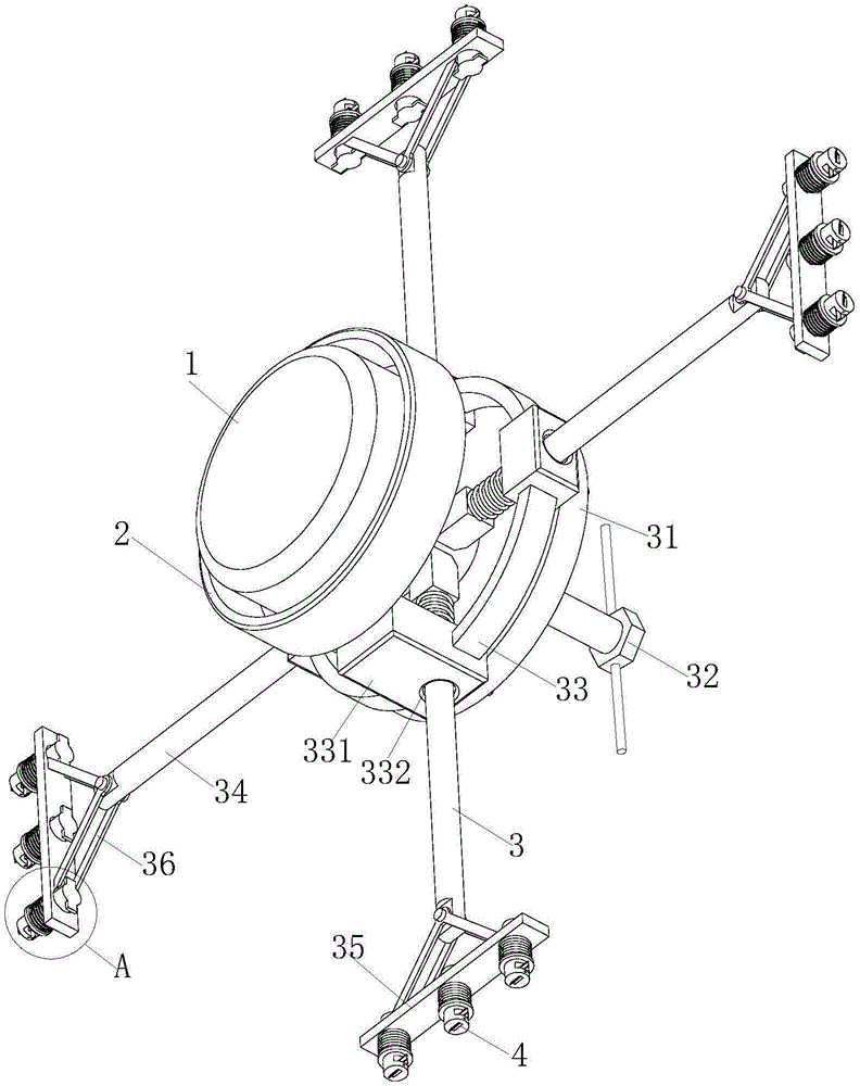 本实用新型涉及压力管道监控技术领域,尤其涉及一种分布式光纤压力管网在线泄漏监测装置,该装置包括:激光脉冲发生器、放置盒、支撑单元和稳固单元;激光脉冲发生器安置在放置盒内,放置盒通过支撑单元安置在管道内,支撑单元上的安置稳固单元;支撑单元包括固定盘、驱动杆、环形座、支撑杆、支撑板和三角架;固定盘一端面固接在环形座一端面,固定盘中心位置螺纹连接驱动杆,且驱动杆端部为圆锥状;环形座上均匀设有四个连接块,连接块一端面固接放置盒下底面,每个连接块上开设一号通孔,一号通孔安置支撑杆;支撑杆一端铰接三角架,三角架端部固接支撑板,支撑杆的另一端设有斜面,且斜面贴附在驱动杆的端部。