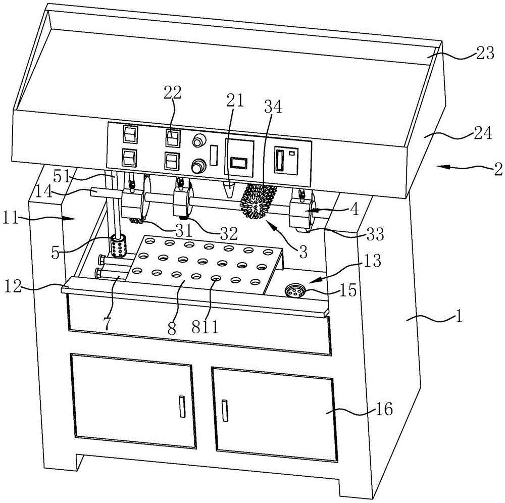 本实用新型公开了一种洗鞋机,包括机体以及一体连接于所述机体上方的控制台,所述机体的一侧开设有供鞋子放入的开口,所述机体内位于所述开口下方的位置开设有清洗槽,所述控制台的下方设有向所述清洗槽内注水的自来水管,所述清洗槽的槽底沿其长度方向设有加热管;所述机体内与所述开口相垂直的两侧壁之间转动连接有转轴,所述转轴上穿设有清洗部,所述清洗部的上方设有喷淋组件,所述清洗槽内设有抽水泵,所述抽水泵的出水口处连通有输水管,所述输水管的另一端与所述喷淋组件相连接。本实用新型的优点是适用于多种材质的鞋子且清洗效果好,同时可以在清洗的过程中对水进行循环使用。